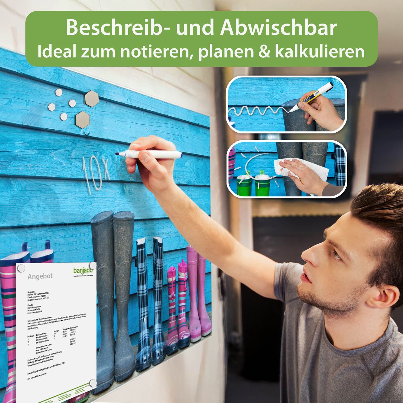Jede Glas Magnettafel wird in unserer Werkstatt von Hand gefertigt und sorgfältig geprüft. So erhalten Sie ein echtes Qualitätsprodukt, das Funktion und Ästhetik perfekt vereint.?? Warum banjado?