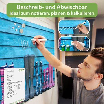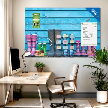 Die banjado Glas Magnettafel mit dem Motiv Motiv Gummistiefel verbindet Funktionalität mit Stil. Sie ersetzt das Zettelchaos durch klare Strukturen und bringt dabei eine warme, natürliche Atmosphäre in Ihr Zuhause. Ob im Büro, in der Küche oder im Eingangsbereich - dieses Design-Board zieht Blicke an und sorgt für Ordnung mit Charakter.