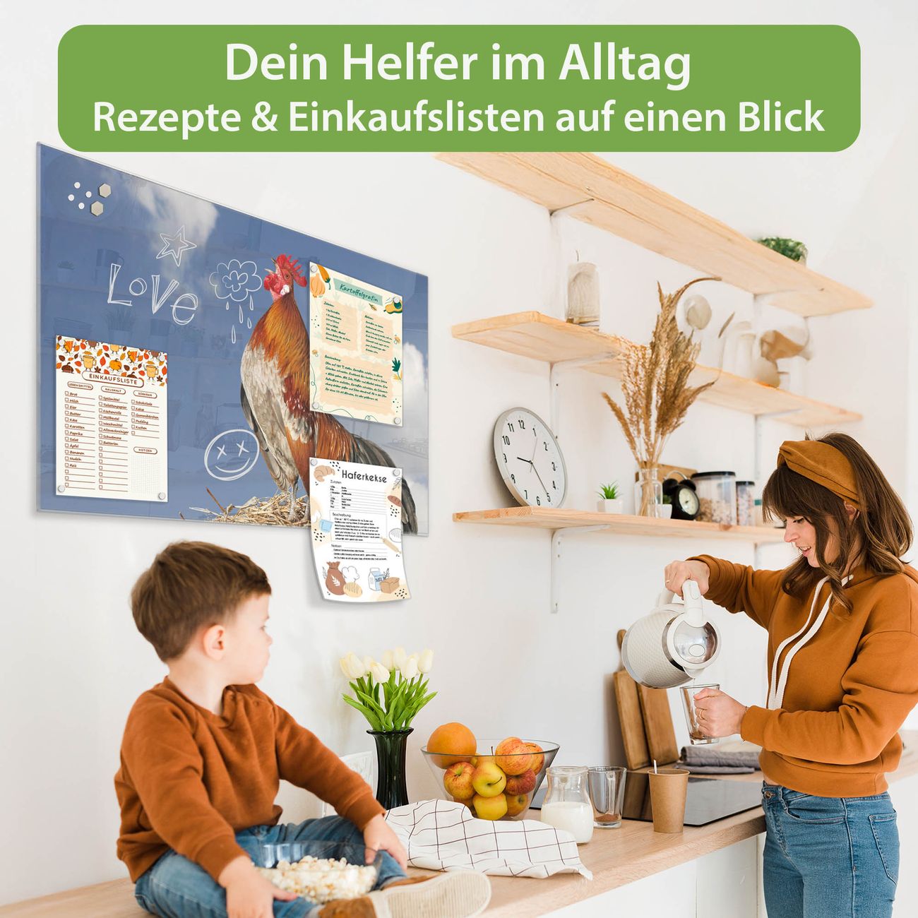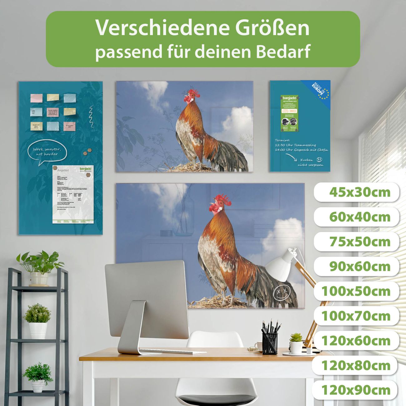 Die banjado Glas Magnettafel mit dem Motiv Motiv Hahn verbindet Funktionalität mit Stil. Sie ersetzt das Zettelchaos durch klare Strukturen und bringt dabei eine warme, natürliche Atmosphäre in Ihr Zuhause. Ob im Büro, in der Küche oder im Eingangsbereich - dieses Design-Board zieht Blicke an und sorgt für Ordnung mit Charakter.