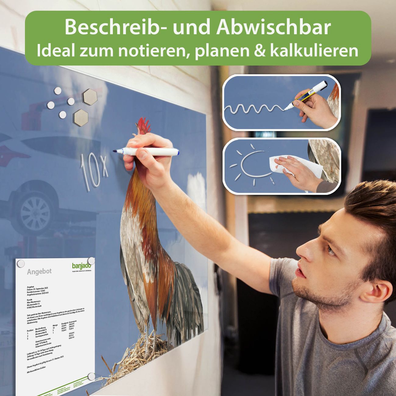 Jede Glas Magnettafel wird in unserer Werkstatt von Hand gefertigt und sorgfältig geprüft. So erhalten Sie ein echtes Qualitätsprodukt, das Funktion und Ästhetik perfekt vereint.?? Warum banjado?