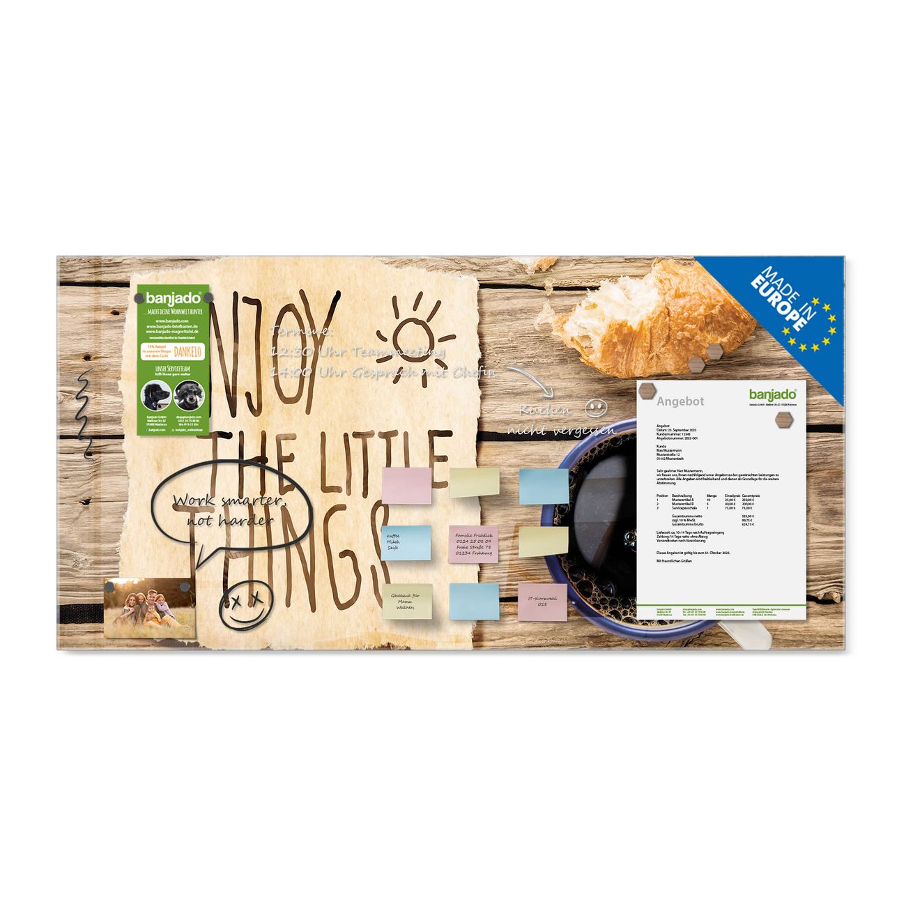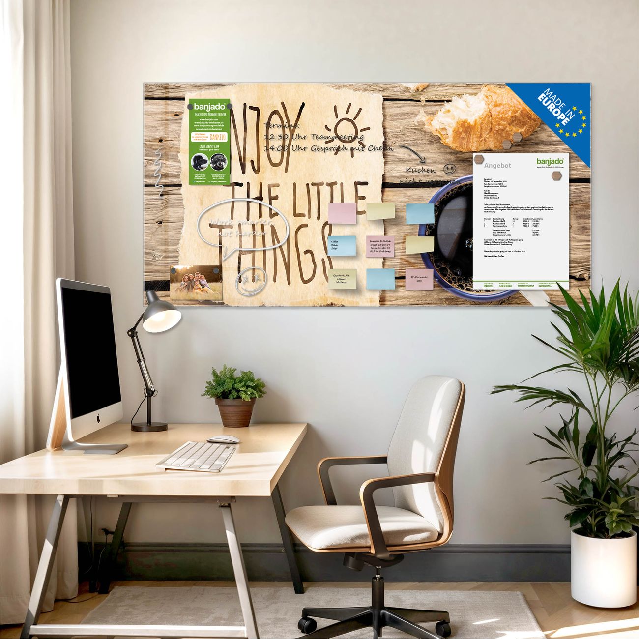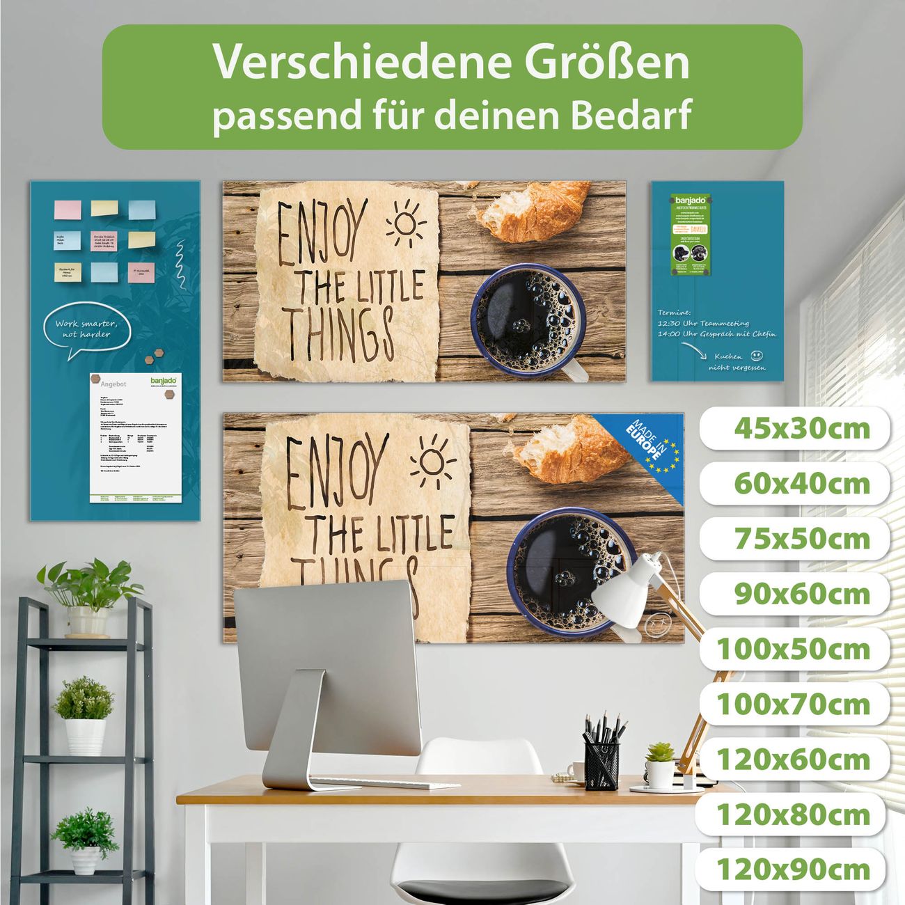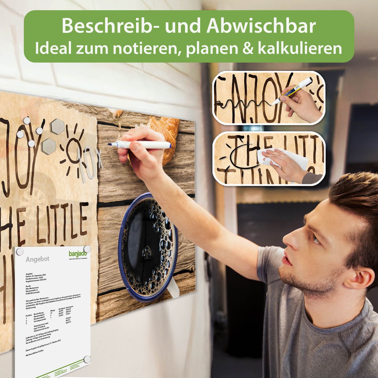 Jede Glas Magnettafel wird in unserer Werkstatt von Hand gefertigt und sorgfältig geprüft. So erhalten Sie ein echtes Qualitätsprodukt, das Funktion und Ästhetik perfekt vereint.?? Warum banjado?