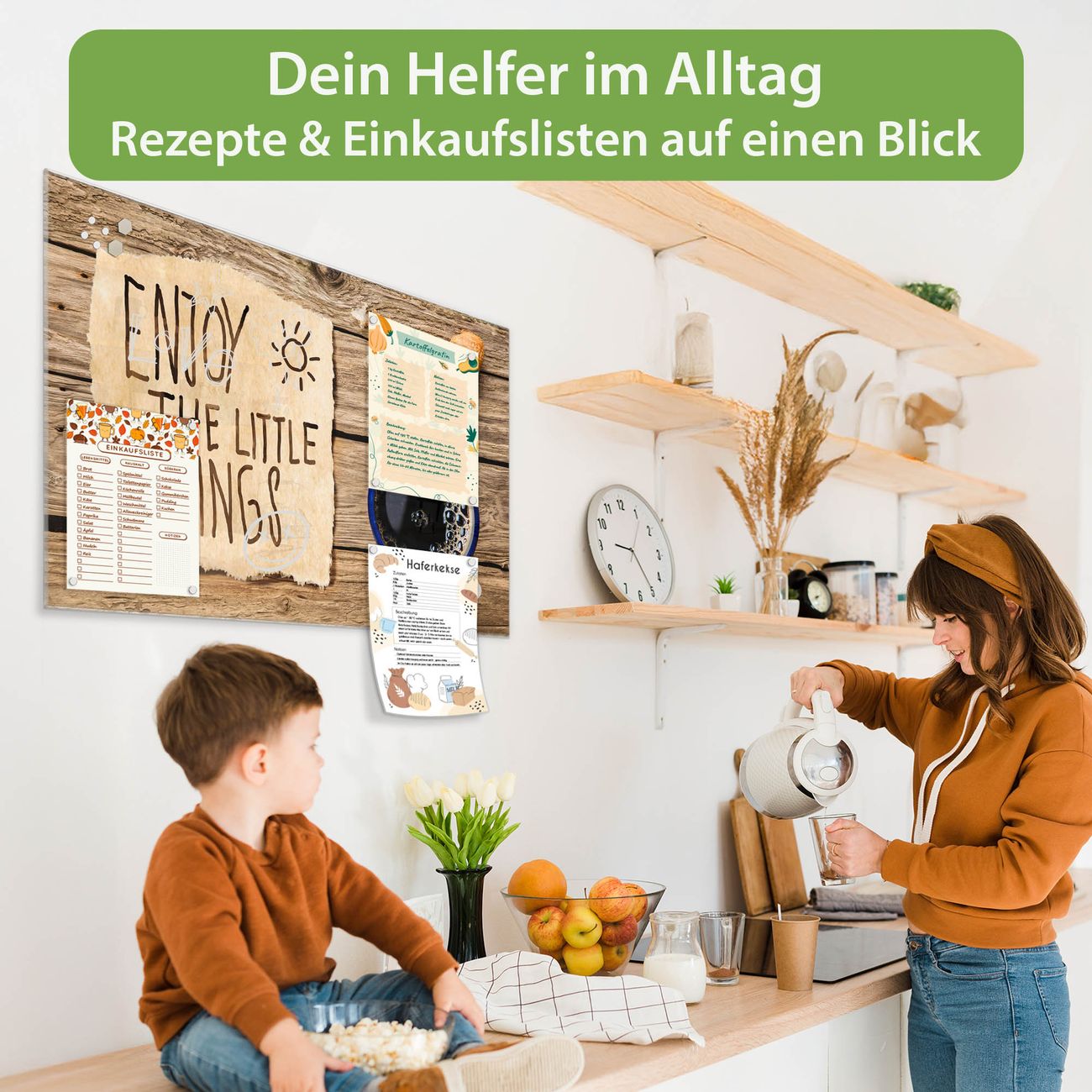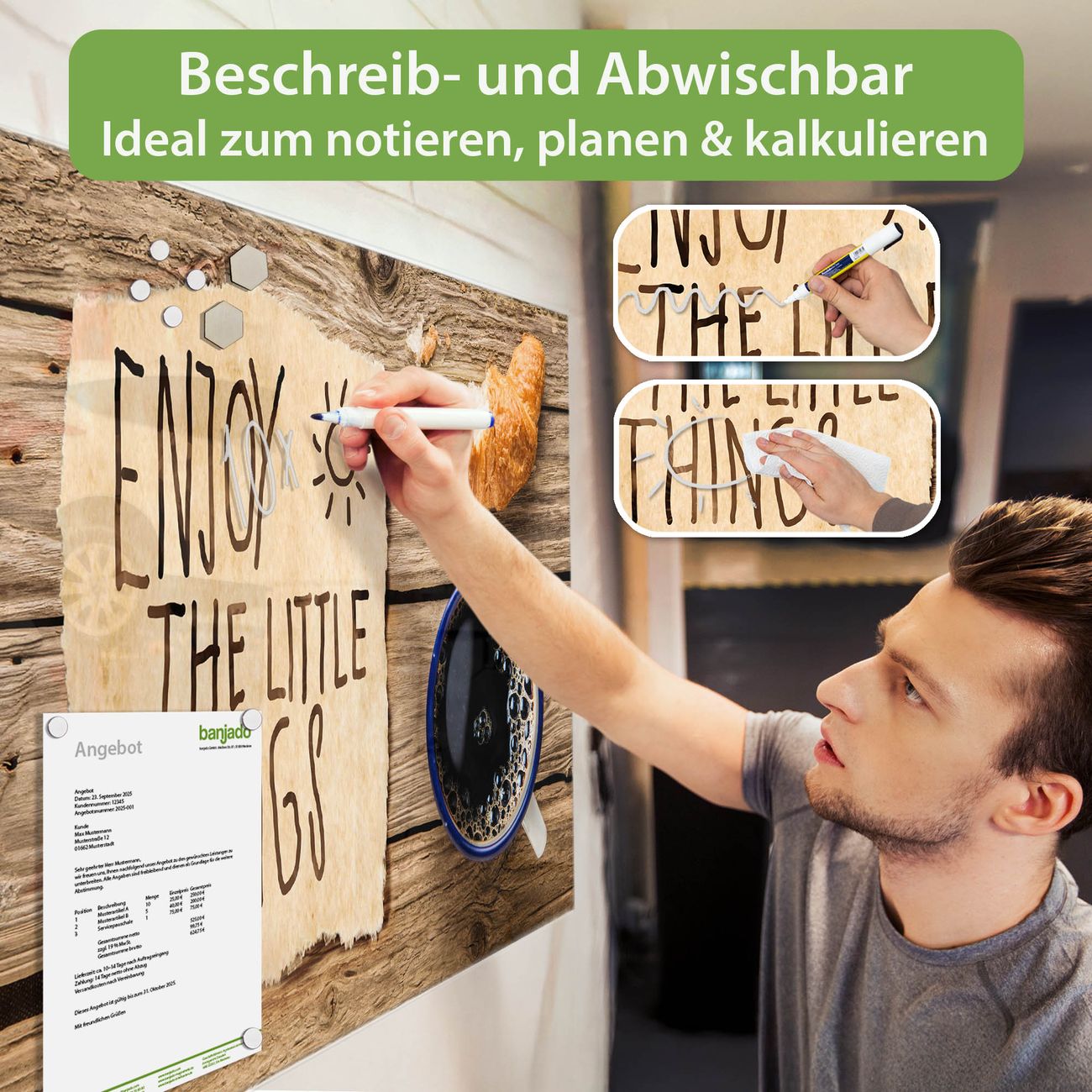 Auf der glatten Glasoberfläche lassen sich Termine, Rezepte oder Notizen ganz einfach mit Kreidestiften festhalten und rückstandslos entfernen. Starke Neodym-Magnete halten Ihre wichtigsten Erinnerungen sicher an Ort und Stelle. So entsteht Ihre ganz persönliche Ideenwand - jeden Tag neu.