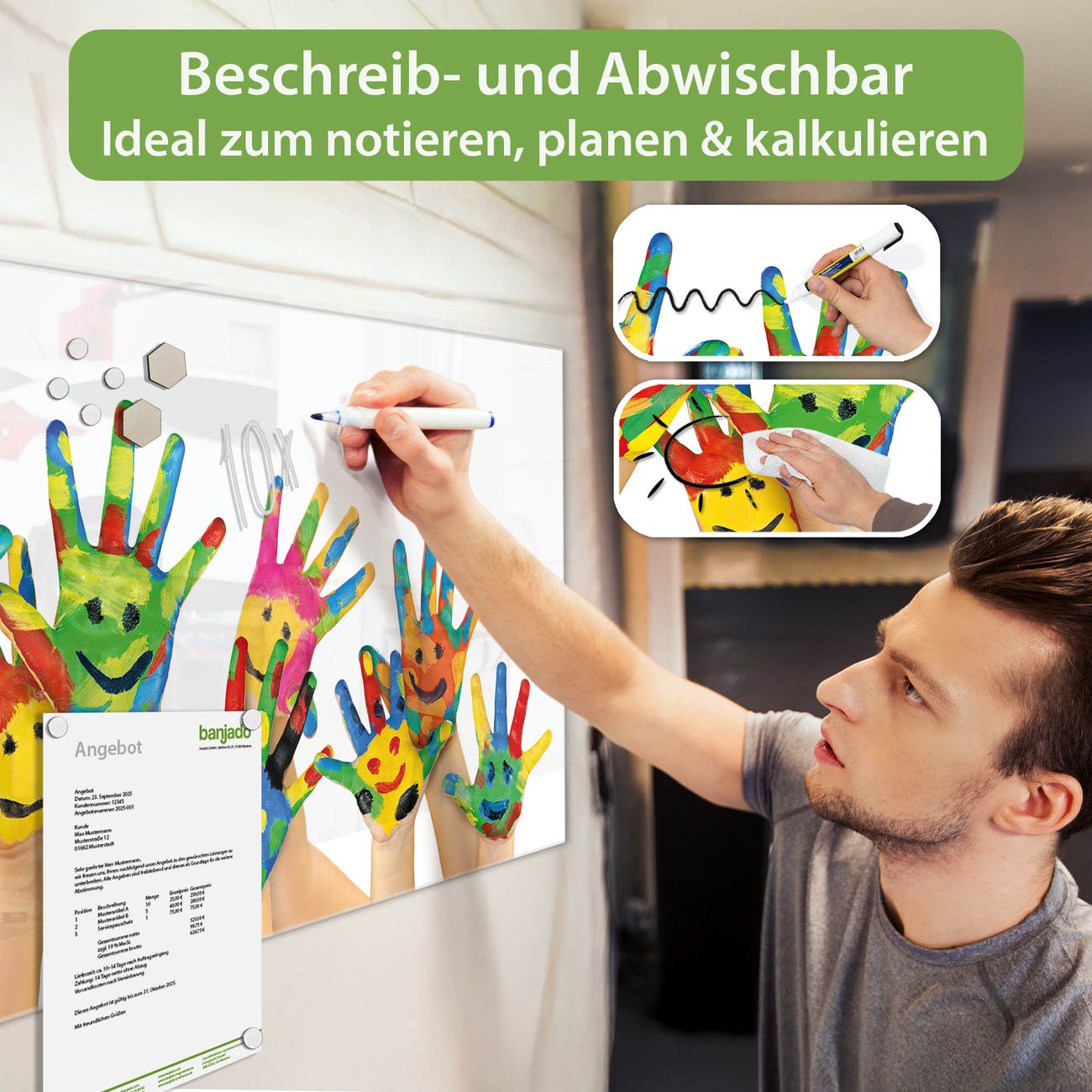 Auf der glatten Glasoberfläche lassen sich Termine, Rezepte oder Notizen ganz einfach mit Kreidestiften festhalten und rückstandslos entfernen. Starke Neodym-Magnete halten Ihre wichtigsten Erinnerungen sicher an Ort und Stelle. So entsteht Ihre ganz persönliche Ideenwand - jeden Tag neu.