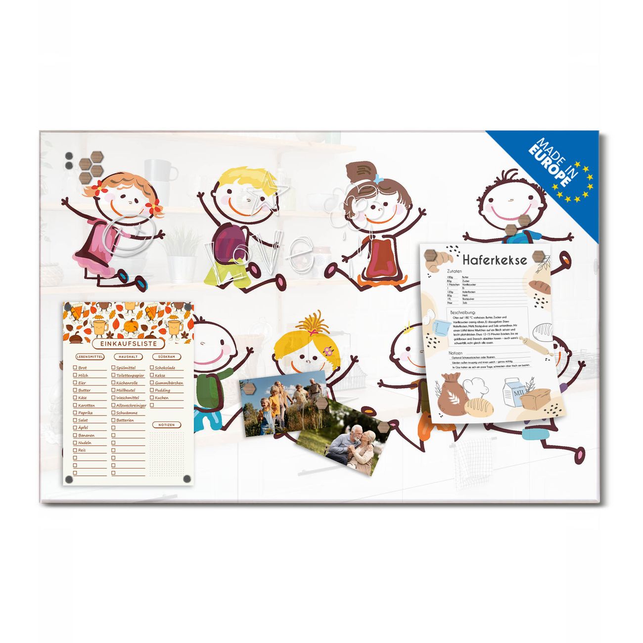 Ein Stück Design, das Ihren Alltag organisiert. Schreiben, heften, inspirieren - alles an einem Ort. Qualität, die man spürt. Montage leicht gemacht. Handwerk mit Herz - veredelt in Sachsen. Einzigartiges Design mit Motiv Motiv Happy Kids Beschreibbare Glasoberfläche, leicht zu reinigen Starke Magnetkraft durch Stahlrückwand Inklusive 4 Neodym-Magneten Flexible Montageoptionen Handveredelt in Sachsen - Qualität, die bleibt