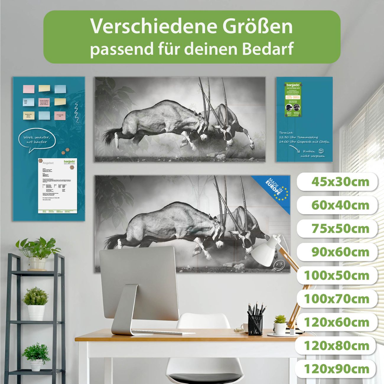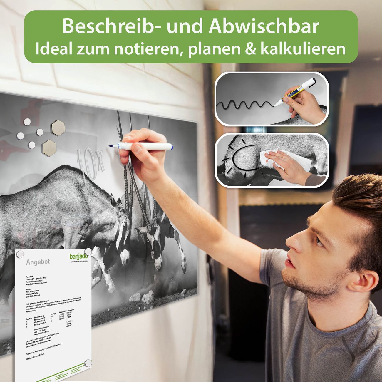 Jede Glas Magnettafel wird in unserer Werkstatt von Hand gefertigt und sorgfältig geprüft. So erhalten Sie ein echtes Qualitätsprodukt, das Funktion und Ästhetik perfekt vereint.?? Warum banjado?