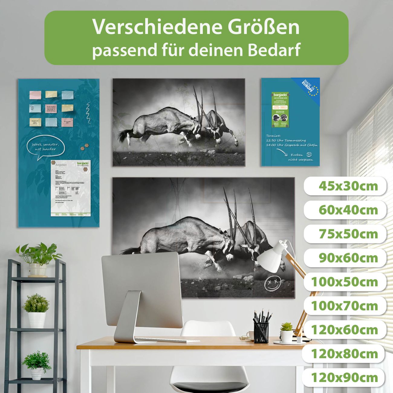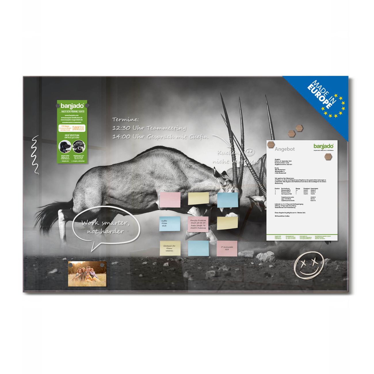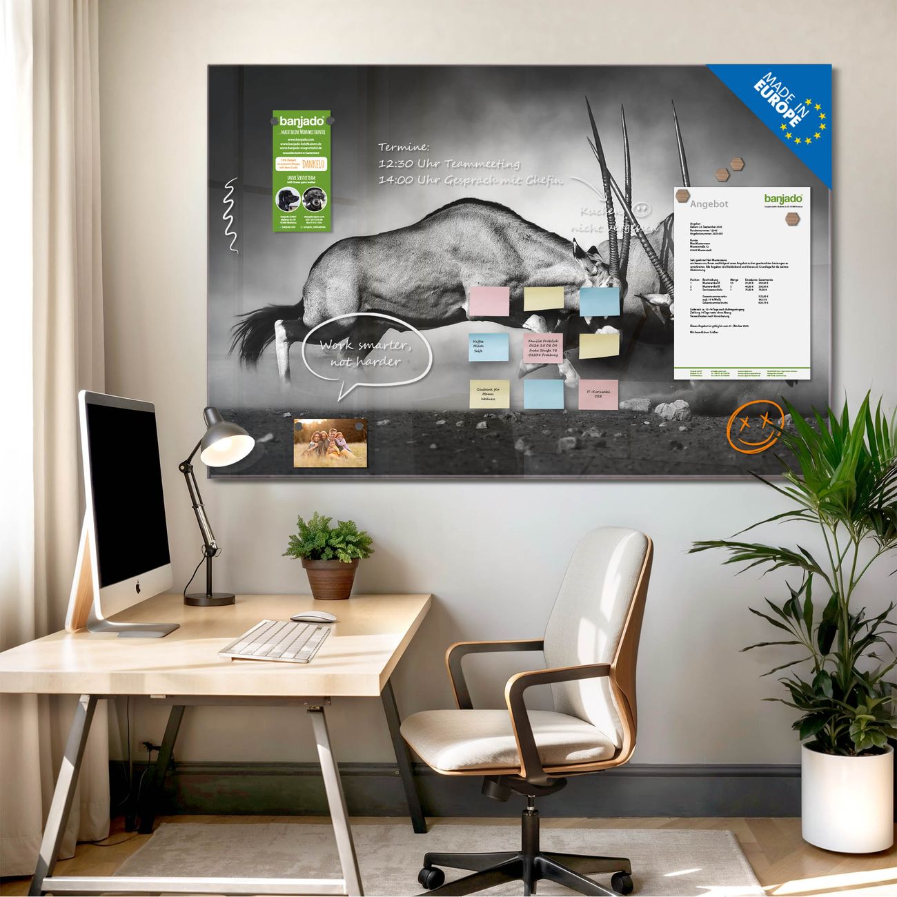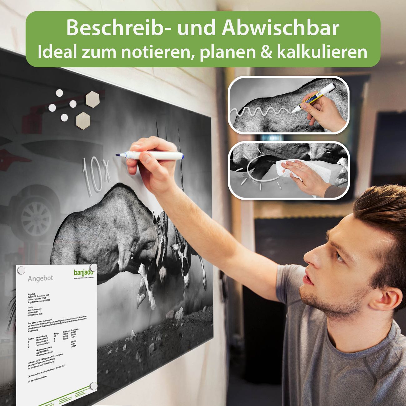 Jede Glas Magnettafel wird in unserer Werkstatt von Hand gefertigt und sorgfältig geprüft. So erhalten Sie ein echtes Qualitätsprodukt, das Funktion und Ästhetik perfekt vereint.?? Warum banjado?