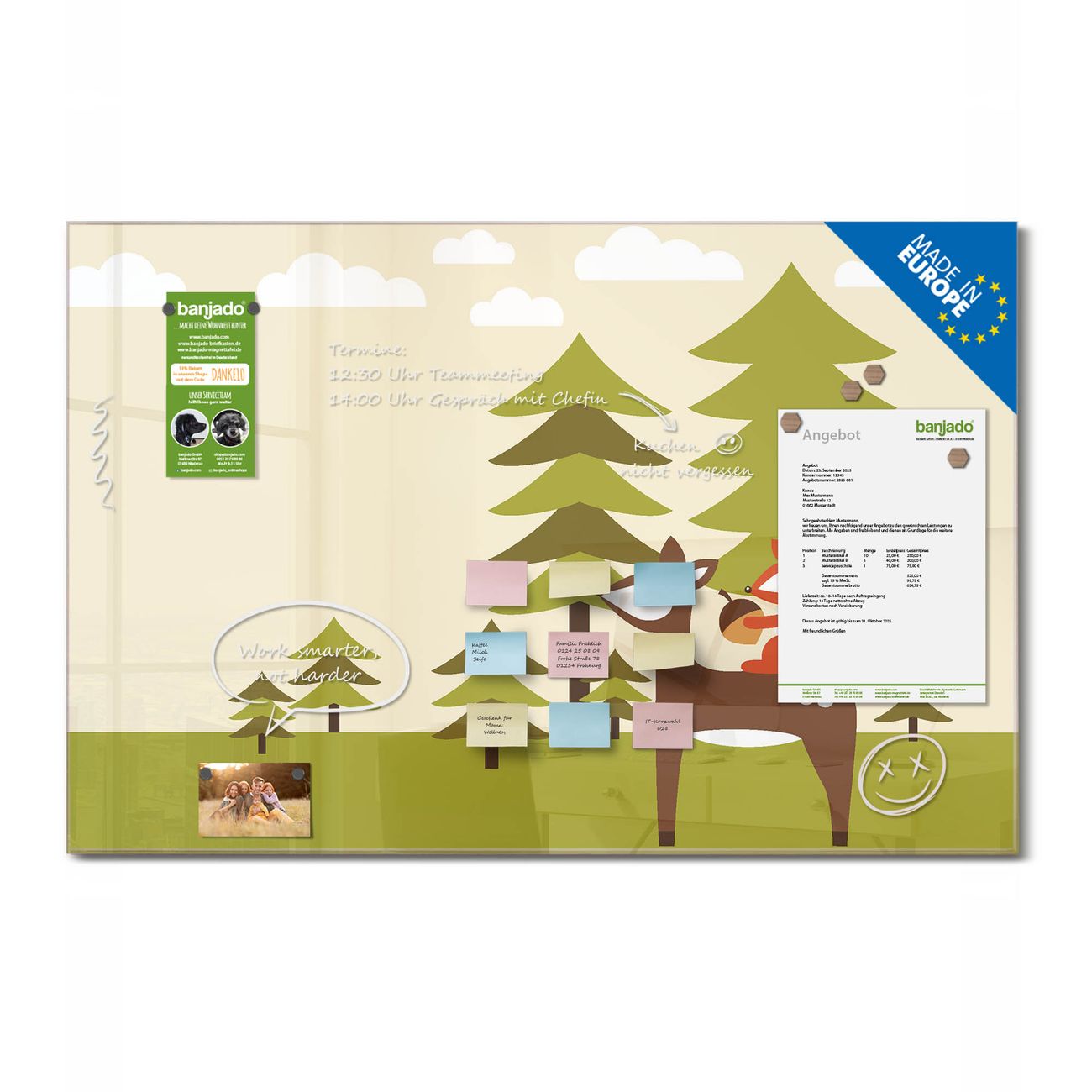 Jede Glas Magnettafel wird in unserer Werkstatt von Hand gefertigt und sorgfältig geprüft. So erhalten Sie ein echtes Qualitätsprodukt, das Funktion und Ästhetik perfekt vereint.?? Warum banjado?