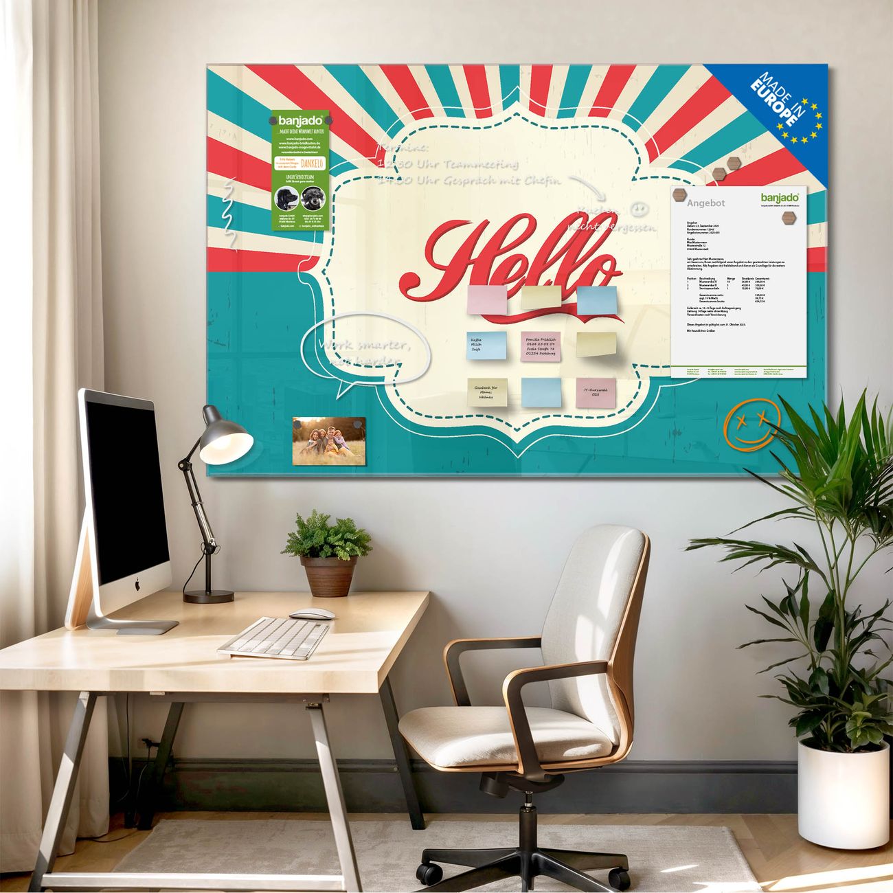 Jede Glas Magnettafel wird in unserer Werkstatt von Hand gefertigt und sorgfältig geprüft. So erhalten Sie ein echtes Qualitätsprodukt, das Funktion und Ästhetik perfekt vereint.?? Warum banjado?