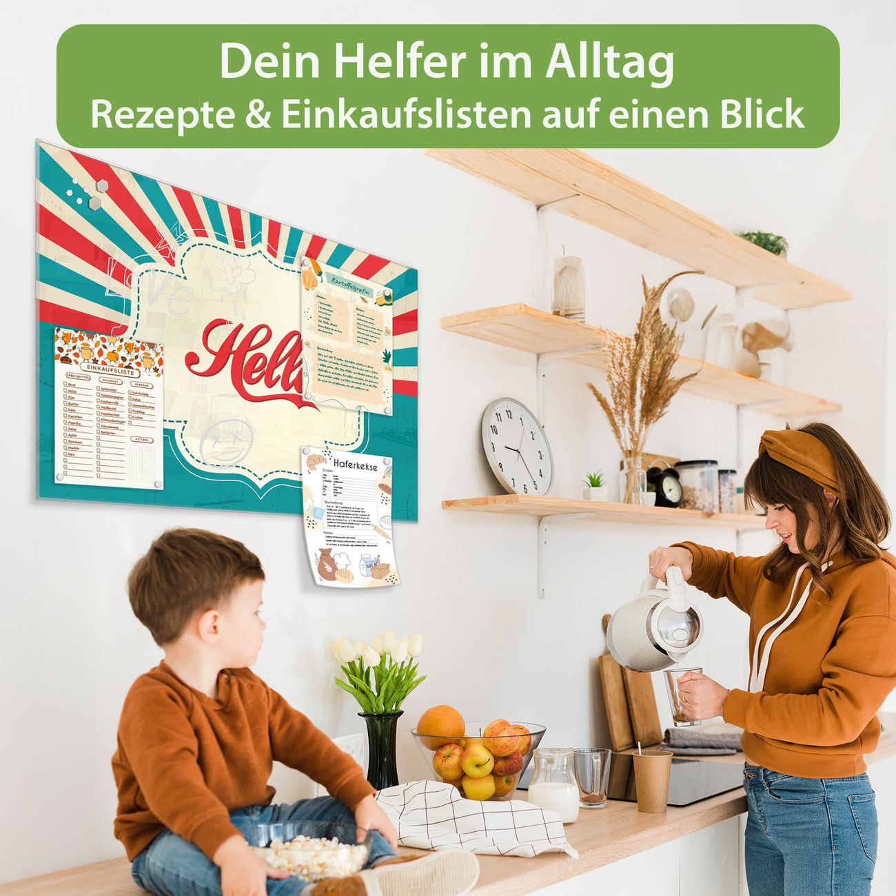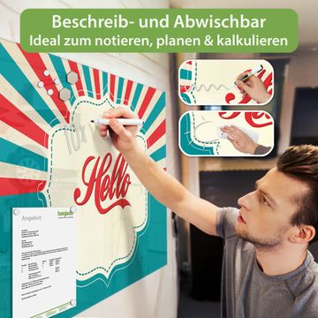 Auf der glatten Glasoberfläche lassen sich Termine, Rezepte oder Notizen ganz einfach mit Kreidestiften festhalten und rückstandslos entfernen. Starke Neodym-Magnete halten Ihre wichtigsten Erinnerungen sicher an Ort und Stelle. So entsteht Ihre ganz persönliche Ideenwand - jeden Tag neu.