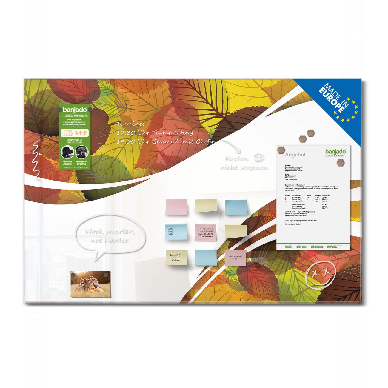 Jede Glas Magnettafel wird in unserer Werkstatt von Hand gefertigt und sorgfältig geprüft. So erhalten Sie ein echtes Qualitätsprodukt, das Funktion und Ästhetik perfekt vereint.?? Warum banjado?