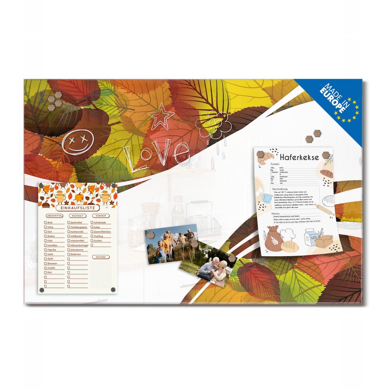 Ein Stück Design, das Ihren Alltag organisiert. Schreiben, heften, inspirieren - alles an einem Ort. Qualität, die man spürt. Montage leicht gemacht. Handwerk mit Herz - veredelt in Sachsen. Einzigartiges Design mit Motiv Motiv Herbstlaub Beschreibbare Glasoberfläche, leicht zu reinigen Starke Magnetkraft durch Stahlrückwand Inklusive 4 Neodym-Magneten Flexible Montageoptionen Handveredelt in Sachsen - Qualität, die bleibt