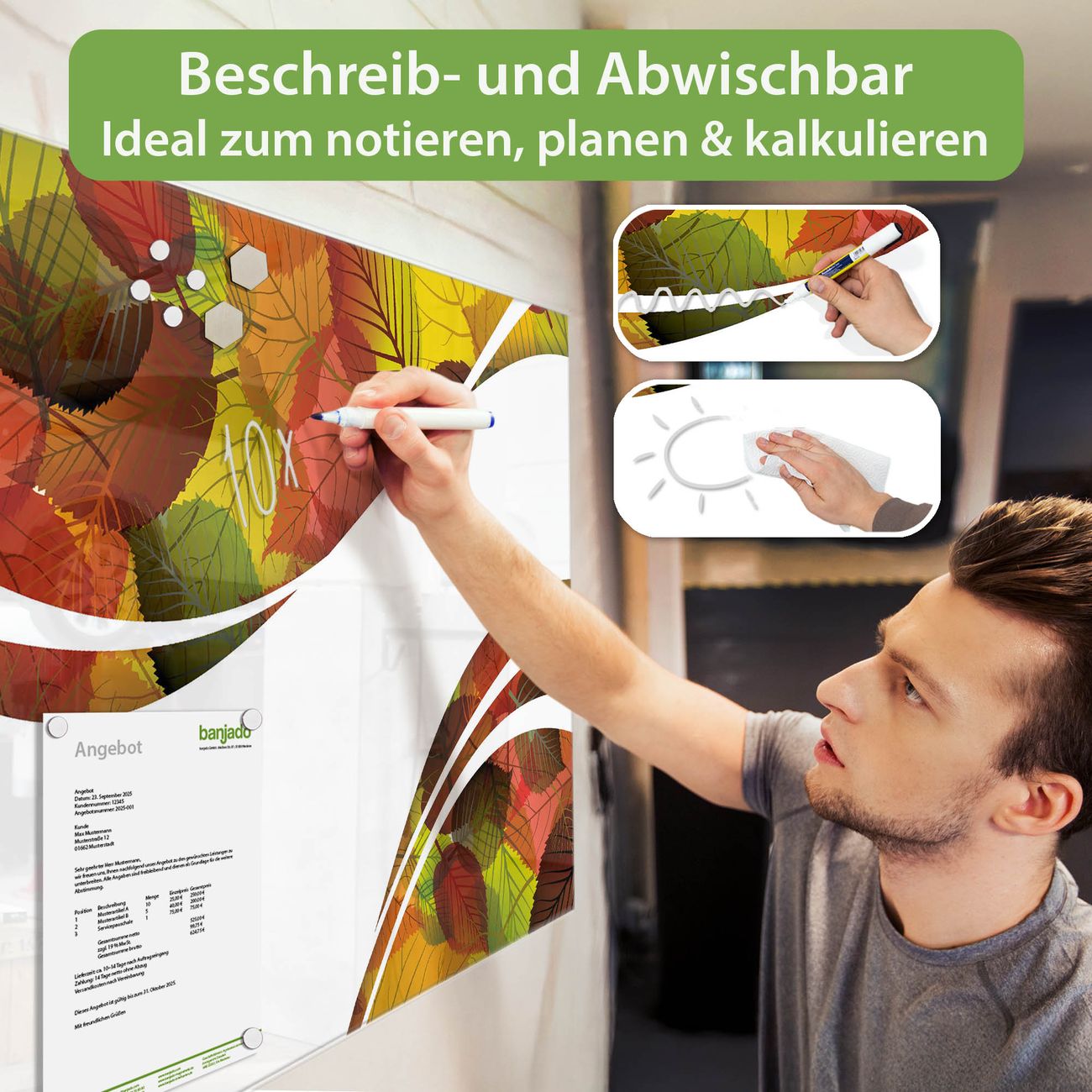 Jede Glas Magnettafel wird in unserer Werkstatt von Hand gefertigt und sorgfältig geprüft. So erhalten Sie ein echtes Qualitätsprodukt, das Funktion und Ästhetik perfekt vereint.?? Warum banjado?