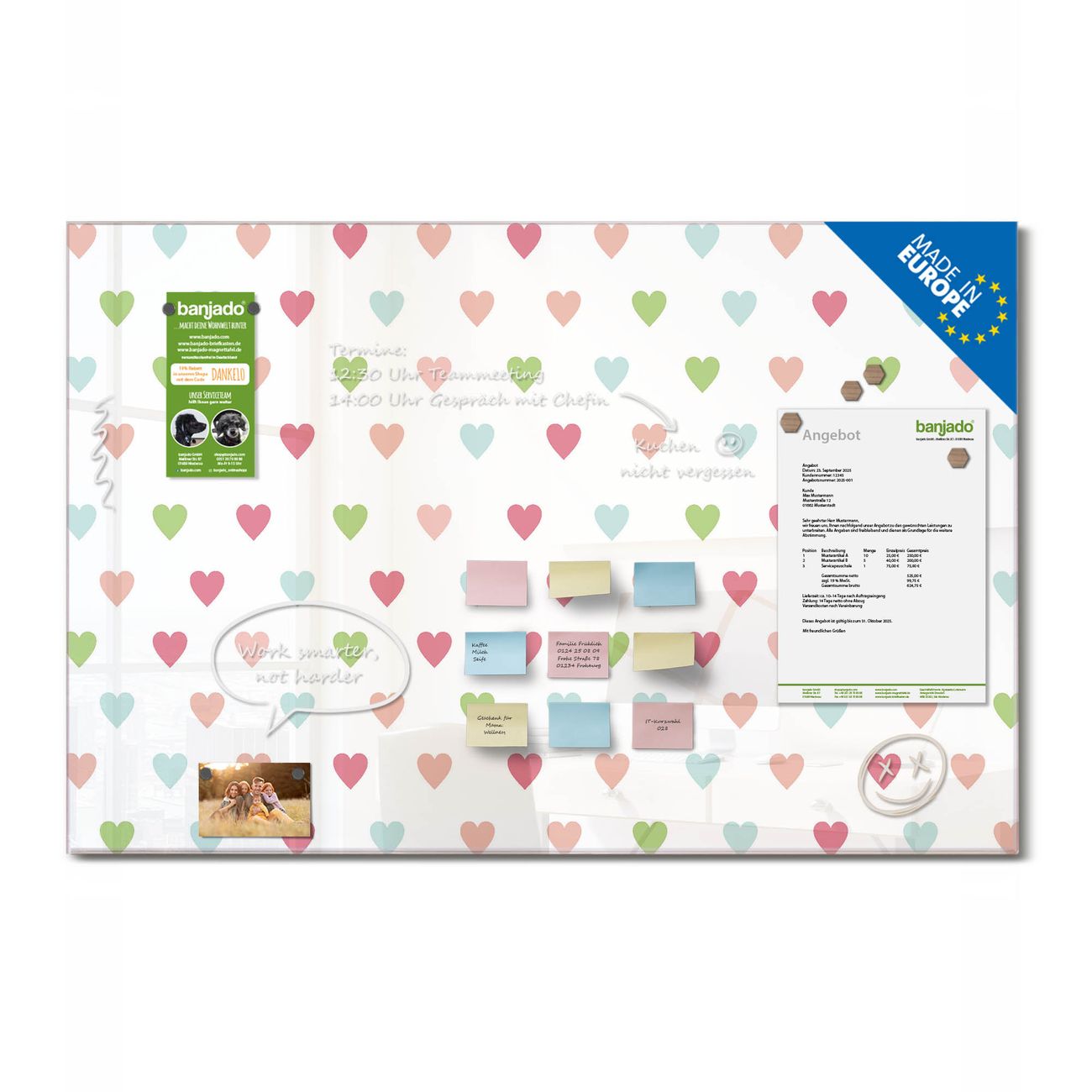 Ein Stück Design, das Ihren Alltag organisiert. Schreiben, heften, inspirieren - alles an einem Ort. Qualität, die man spürt. Montage leicht gemacht. Handwerk mit Herz - veredelt in Sachsen. Einzigartiges Design mit Motiv Motiv Herzen Auf Weiß Beschreibbare Glasoberfläche, leicht zu reinigen Starke Magnetkraft durch Stahlrückwand Inklusive 4 Neodym-Magneten Flexible Montageoptionen Handveredelt in Sachsen - Qualität, die bleibt