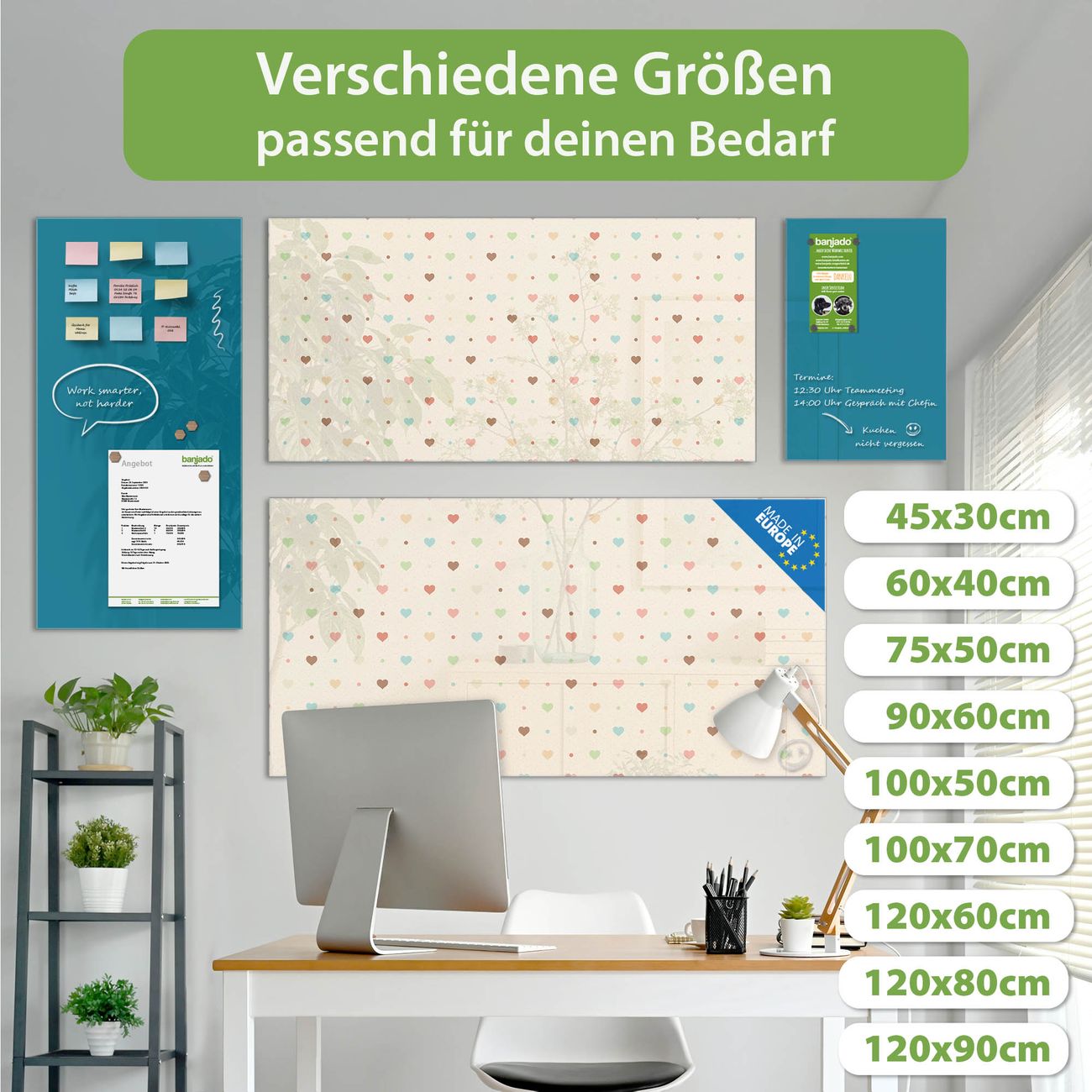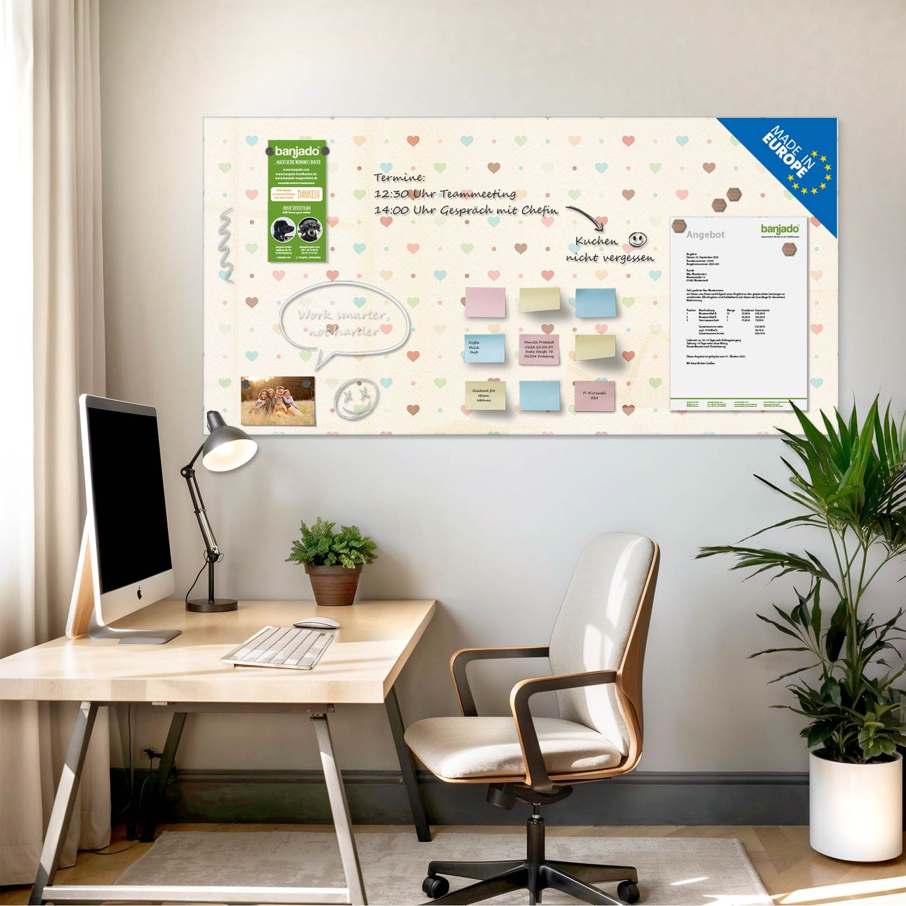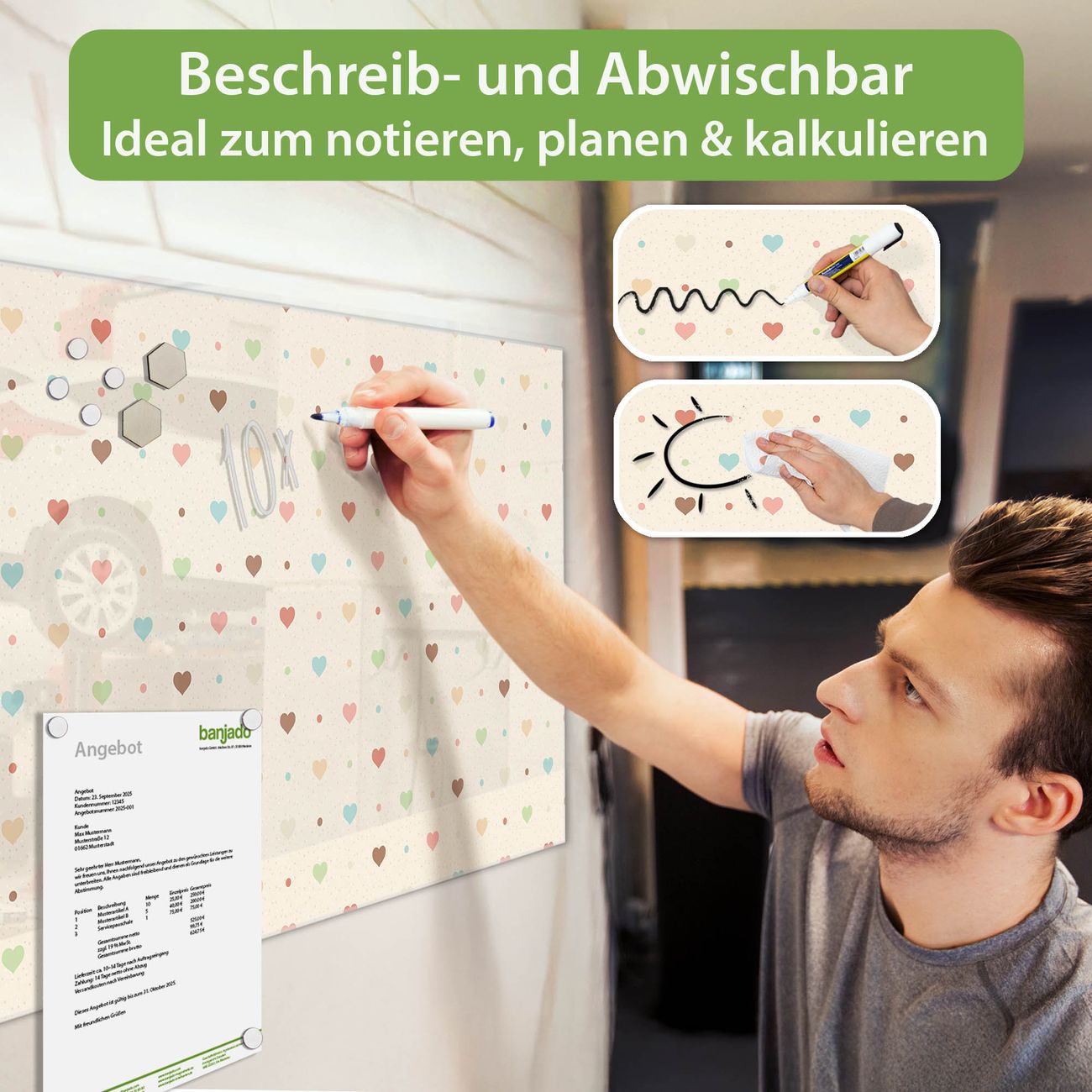 Jede Glas Magnettafel wird in unserer Werkstatt von Hand gefertigt und sorgfältig geprüft. So erhalten Sie ein echtes Qualitätsprodukt, das Funktion und Ästhetik perfekt vereint.?? Warum banjado?