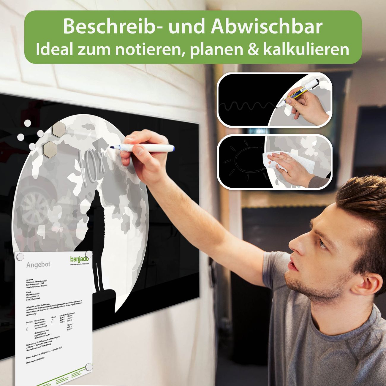 Jede Glas Magnettafel wird in unserer Werkstatt von Hand gefertigt und sorgfältig geprüft. So erhalten Sie ein echtes Qualitätsprodukt, das Funktion und Ästhetik perfekt vereint.?? Warum banjado?