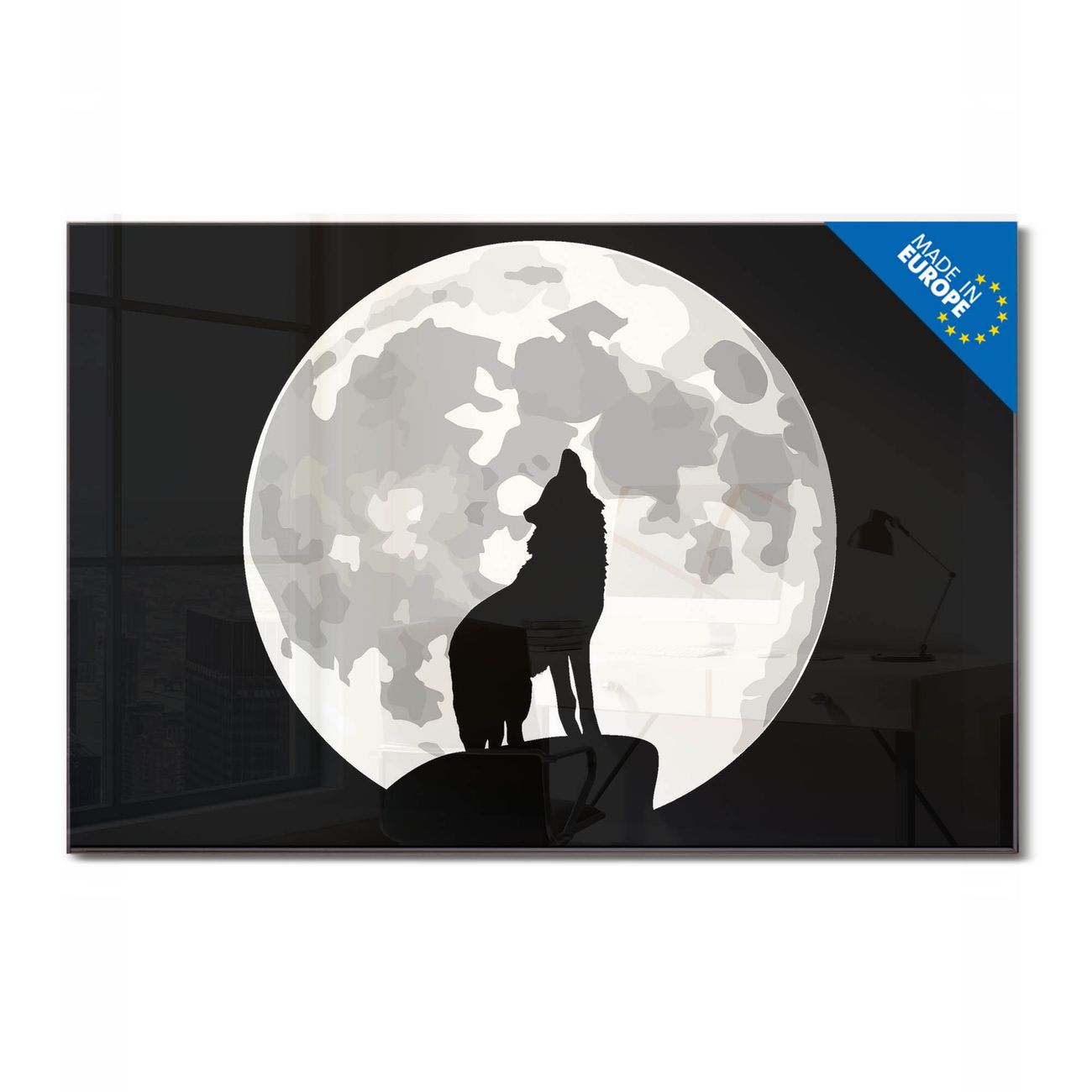 Glas Magnettafel im Querformat Motiv Heulender Wolf SW