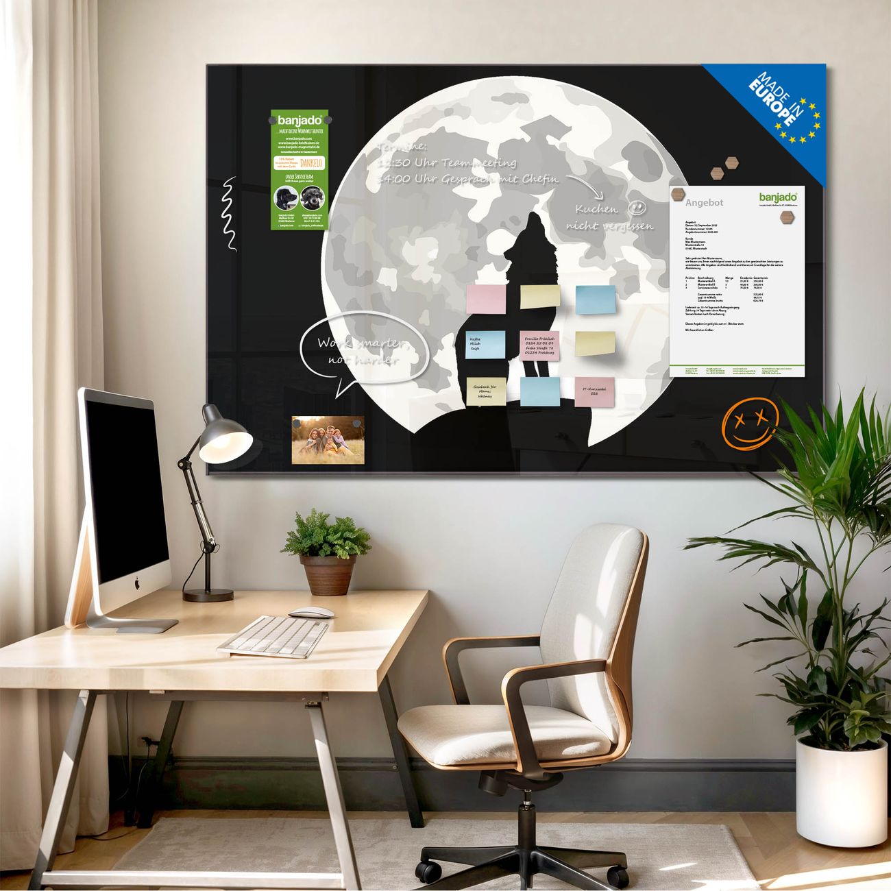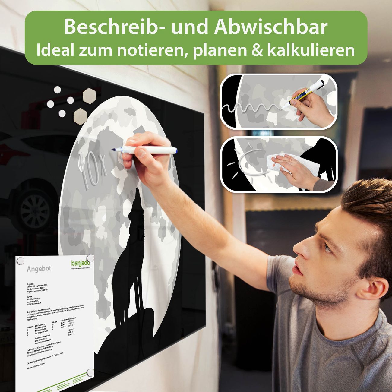 Jede Glas Magnettafel wird in unserer Werkstatt von Hand gefertigt und sorgfältig geprüft. So erhalten Sie ein echtes Qualitätsprodukt, das Funktion und Ästhetik perfekt vereint.?? Warum banjado?