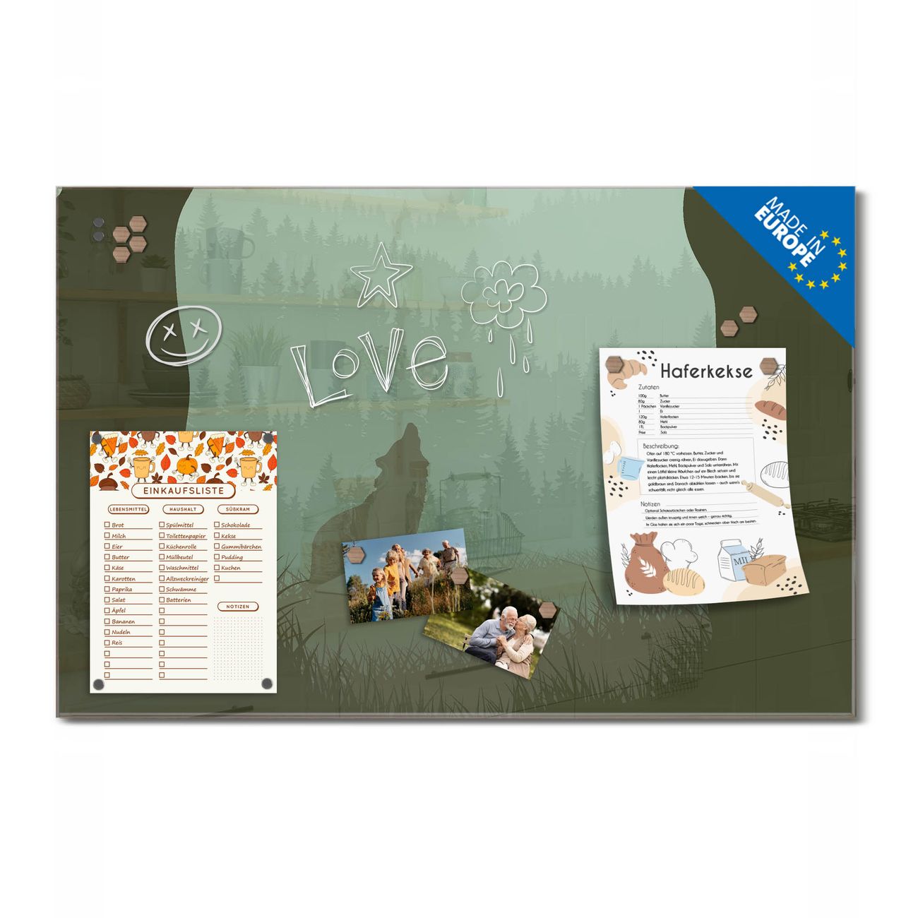 Ein Stück Design, das Ihren Alltag organisiert. Schreiben, heften, inspirieren - alles an einem Ort. Qualität, die man spürt. Montage leicht gemacht. Handwerk mit Herz - veredelt in Sachsen. Einzigartiges Design mit Motiv Motiv Heulender Wolf Beschreibbare Glasoberfläche, leicht zu reinigen Starke Magnetkraft durch Stahlrückwand Inklusive 4 Neodym-Magneten Flexible Montageoptionen Handveredelt in Sachsen - Qualität, die bleibt