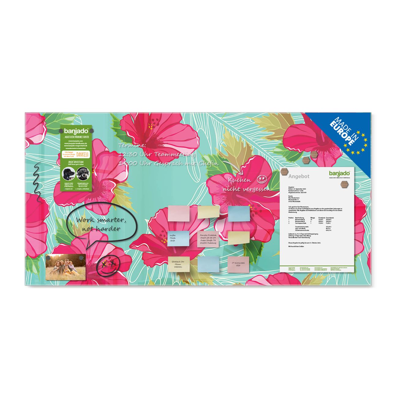 Die banjado Glas Magnettafel mit dem Motiv Motiv Hibiskus verbindet Funktionalität mit Stil. Sie ersetzt das Zettelchaos durch klare Strukturen und bringt dabei eine warme, natürliche Atmosphäre in Ihr Zuhause. Ob im Büro, in der Küche oder im Eingangsbereich - dieses Design-Board zieht Blicke an und sorgt für Ordnung mit Charakter.