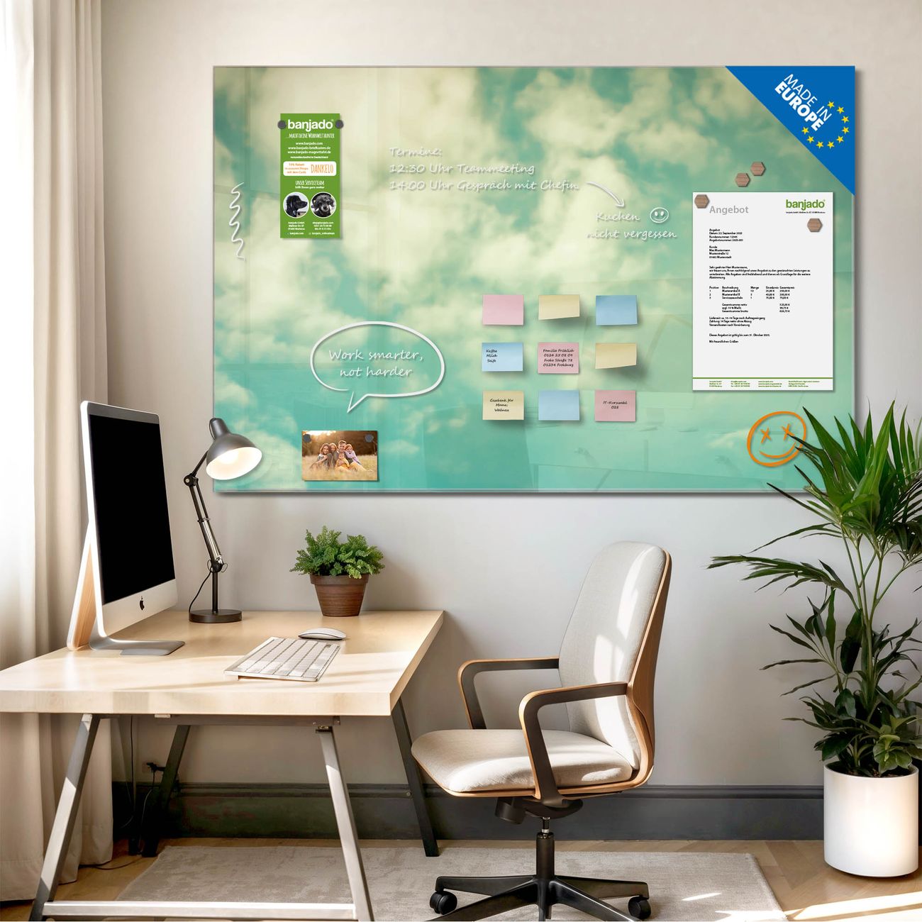 Die banjado Glas Magnettafel mit dem Motiv Motiv Leicht Bewölkt verbindet Funktionalität mit Stil. Sie ersetzt das Zettelchaos durch klare Strukturen und bringt dabei eine warme, natürliche Atmosphäre in Ihr Zuhause. Ob im Büro, in der Küche oder im Eingangsbereich - dieses Design-Board zieht Blicke an und sorgt für Ordnung mit Charakter.