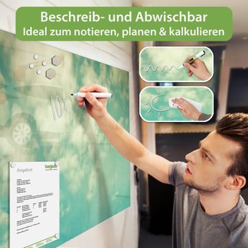 Auf der glatten Glasoberfläche lassen sich Termine, Rezepte oder Notizen ganz einfach mit Kreidestiften festhalten und rückstandslos entfernen. Starke Neodym-Magnete halten Ihre wichtigsten Erinnerungen sicher an Ort und Stelle. So entsteht Ihre ganz persönliche Ideenwand - jeden Tag neu.