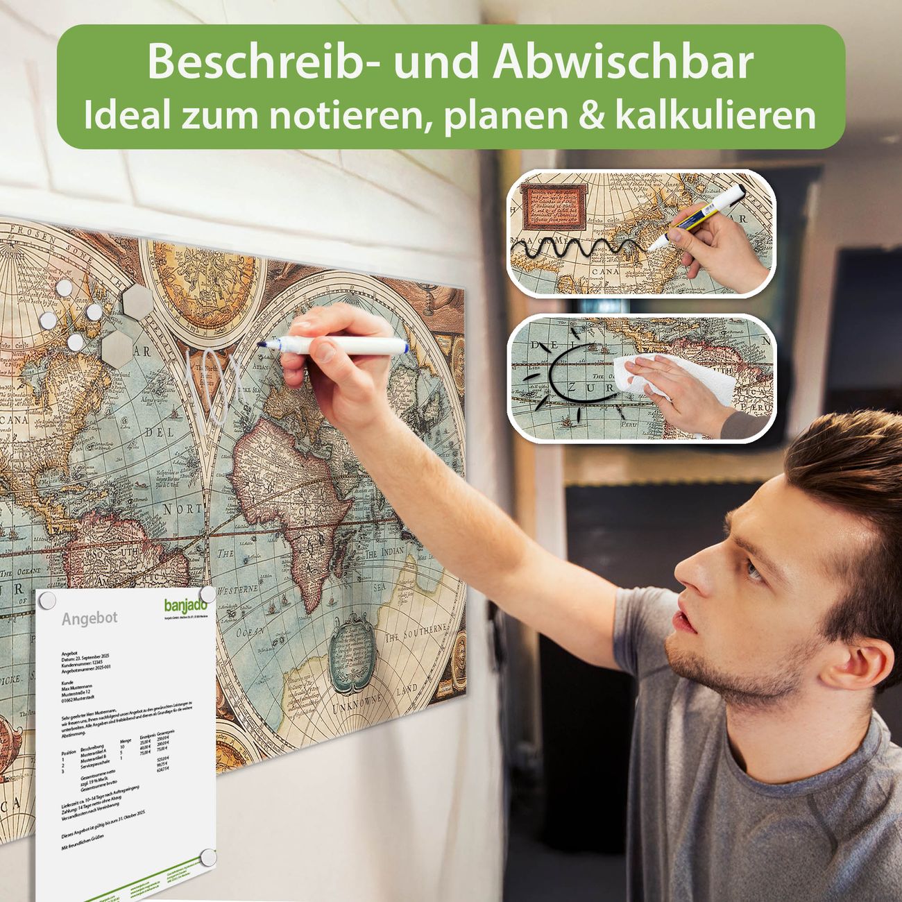 Jede Glas Magnettafel wird in unserer Werkstatt von Hand gefertigt und sorgfältig geprüft. So erhalten Sie ein echtes Qualitätsprodukt, das Funktion und Ästhetik perfekt vereint.?? Warum banjado?
