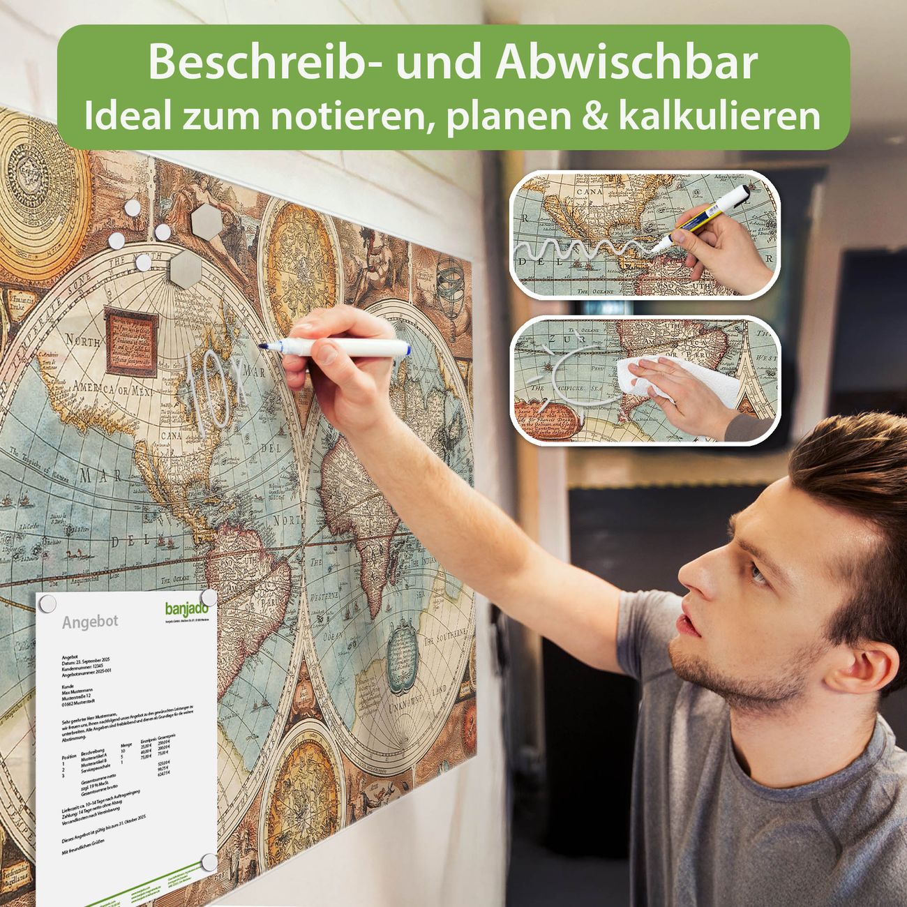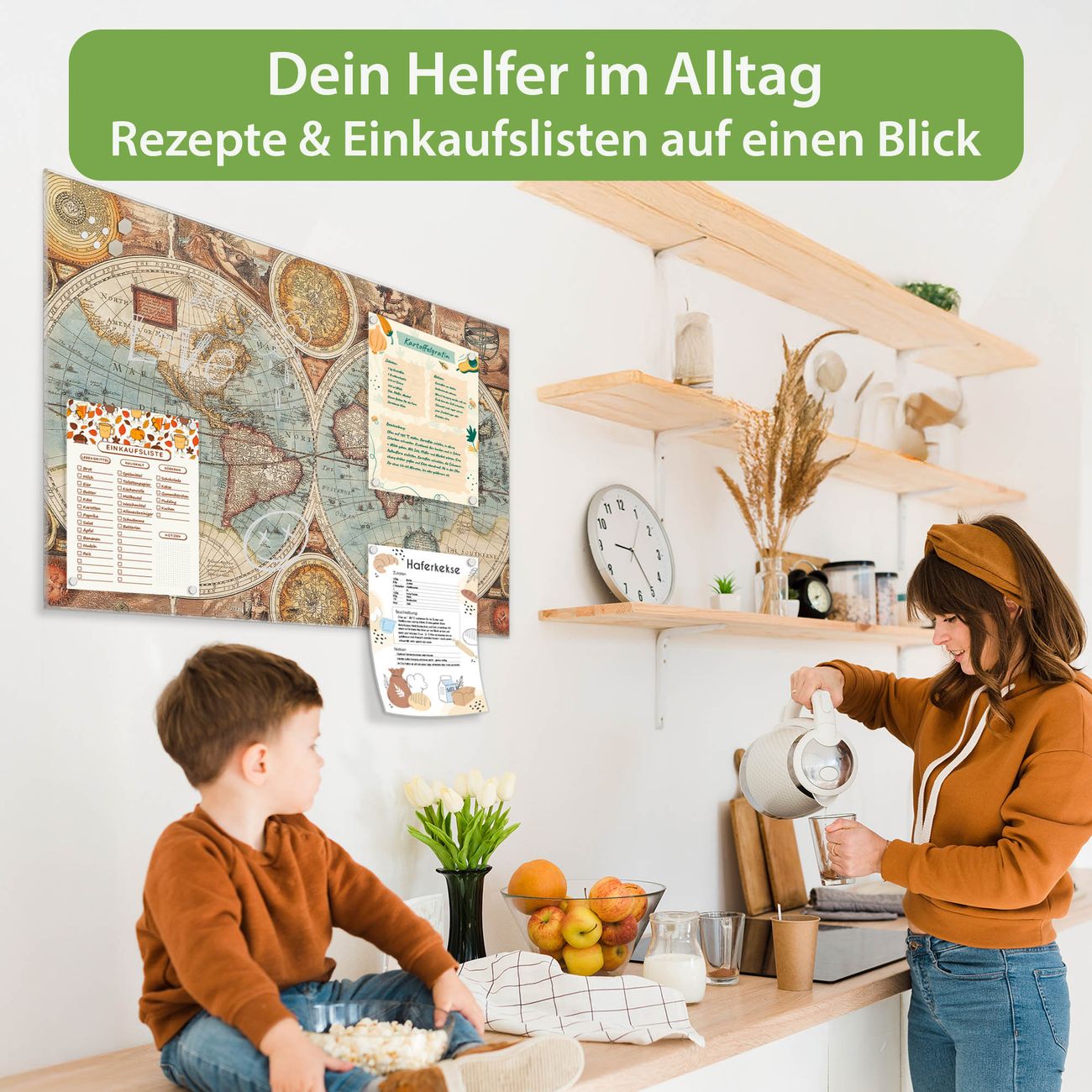 Ein Stück Design, das Ihren Alltag organisiert. Schreiben, heften, inspirieren - alles an einem Ort. Qualität, die man spürt. Montage leicht gemacht. Handwerk mit Herz - veredelt in Sachsen. Einzigartiges Design mit Motiv Motiv Historische Weltkarte Beschreibbare Glasoberfläche, leicht zu reinigen Starke Magnetkraft durch Stahlrückwand Inklusive 4 Neodym-Magneten Flexible Montageoptionen Handveredelt in Sachsen - Qualität, die bleibt