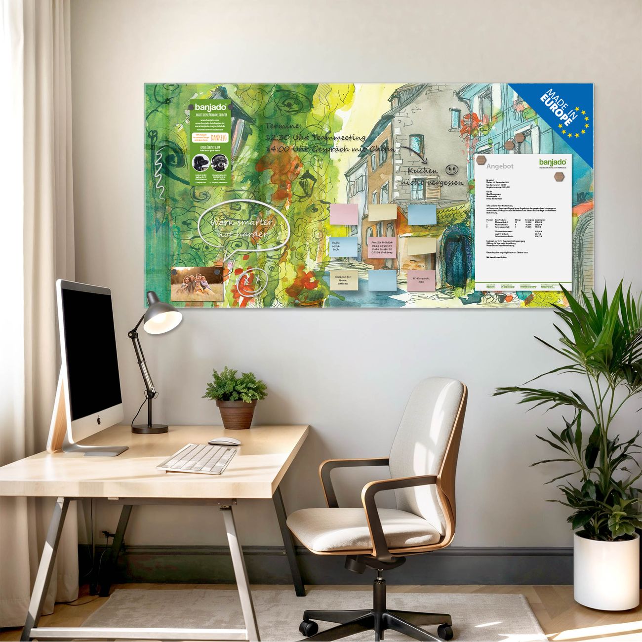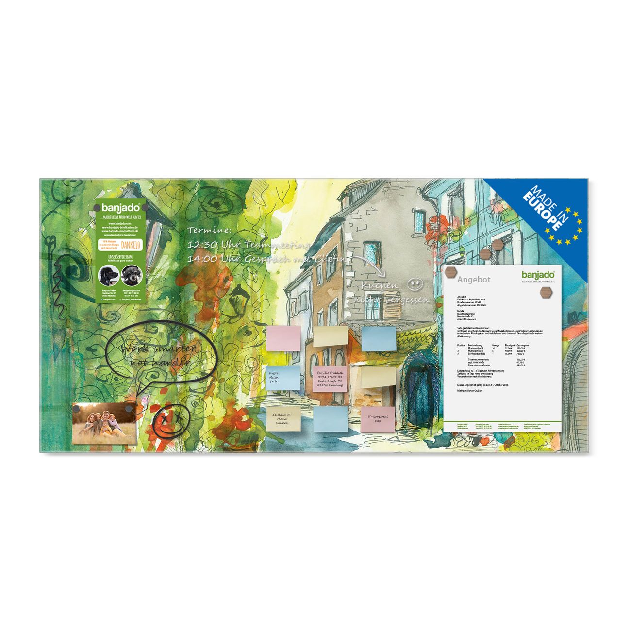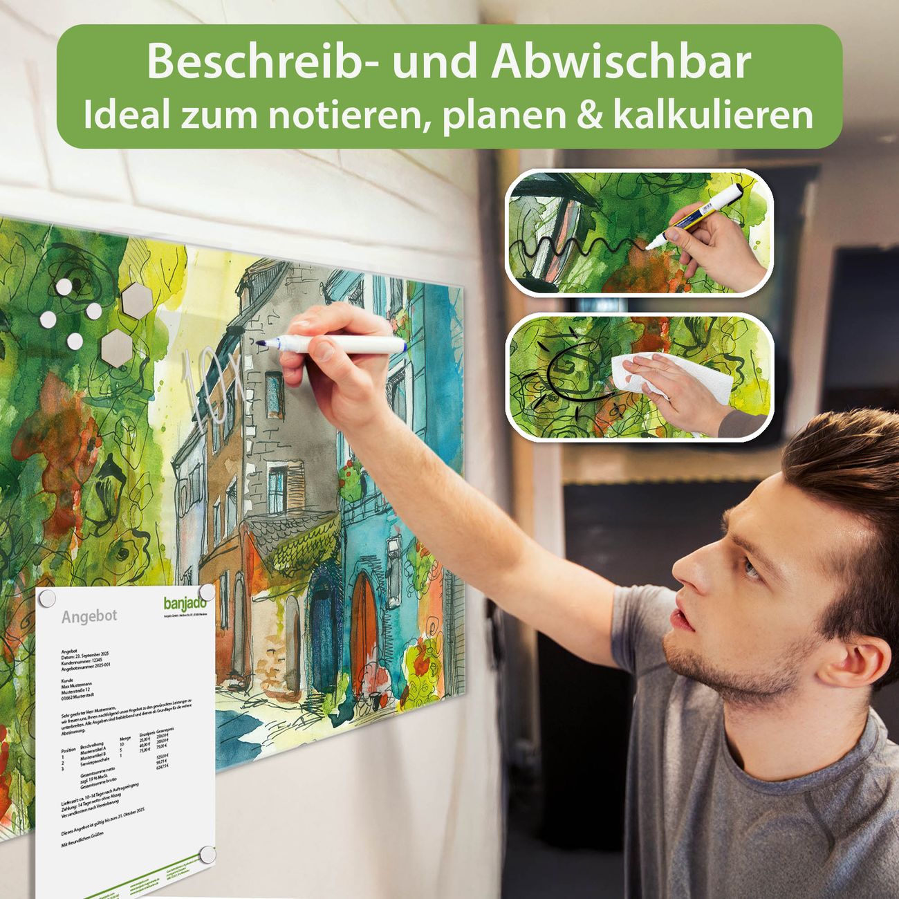 Die banjado Glas Magnettafel mit dem Motiv Motiv Historischer Stadtkern verbindet Funktionalität mit Stil. Sie ersetzt das Zettelchaos durch klare Strukturen und bringt dabei eine warme, natürliche Atmosphäre in Ihr Zuhause. Ob im Büro, in der Küche oder im Eingangsbereich - dieses Design-Board zieht Blicke an und sorgt für Ordnung mit Charakter.