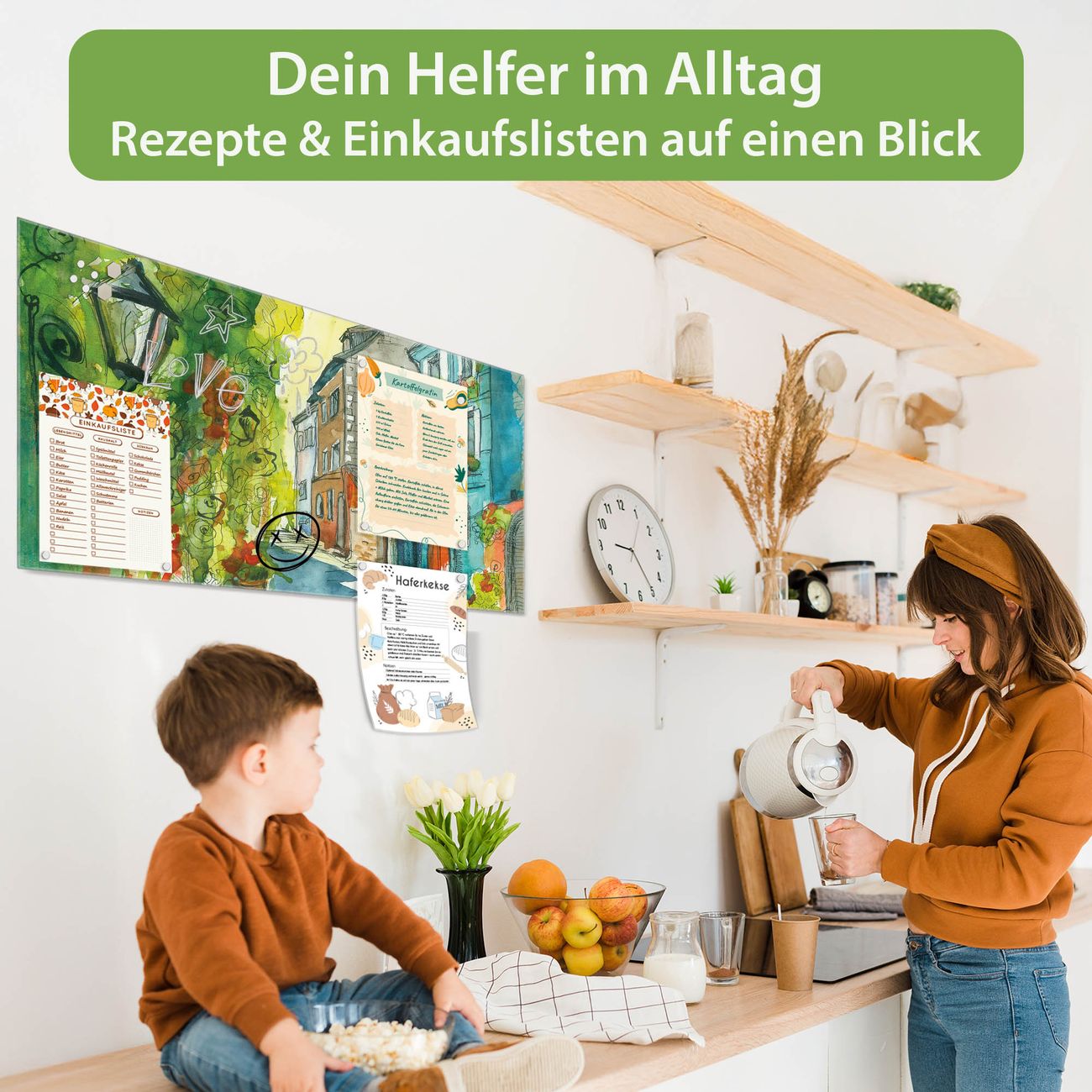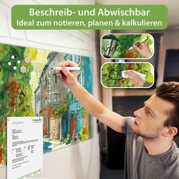 Auf der glatten Glasoberfläche lassen sich Termine, Rezepte oder Notizen ganz einfach mit Kreidestiften festhalten und rückstandslos entfernen. Starke Neodym-Magnete halten Ihre wichtigsten Erinnerungen sicher an Ort und Stelle. So entsteht Ihre ganz persönliche Ideenwand - jeden Tag neu.