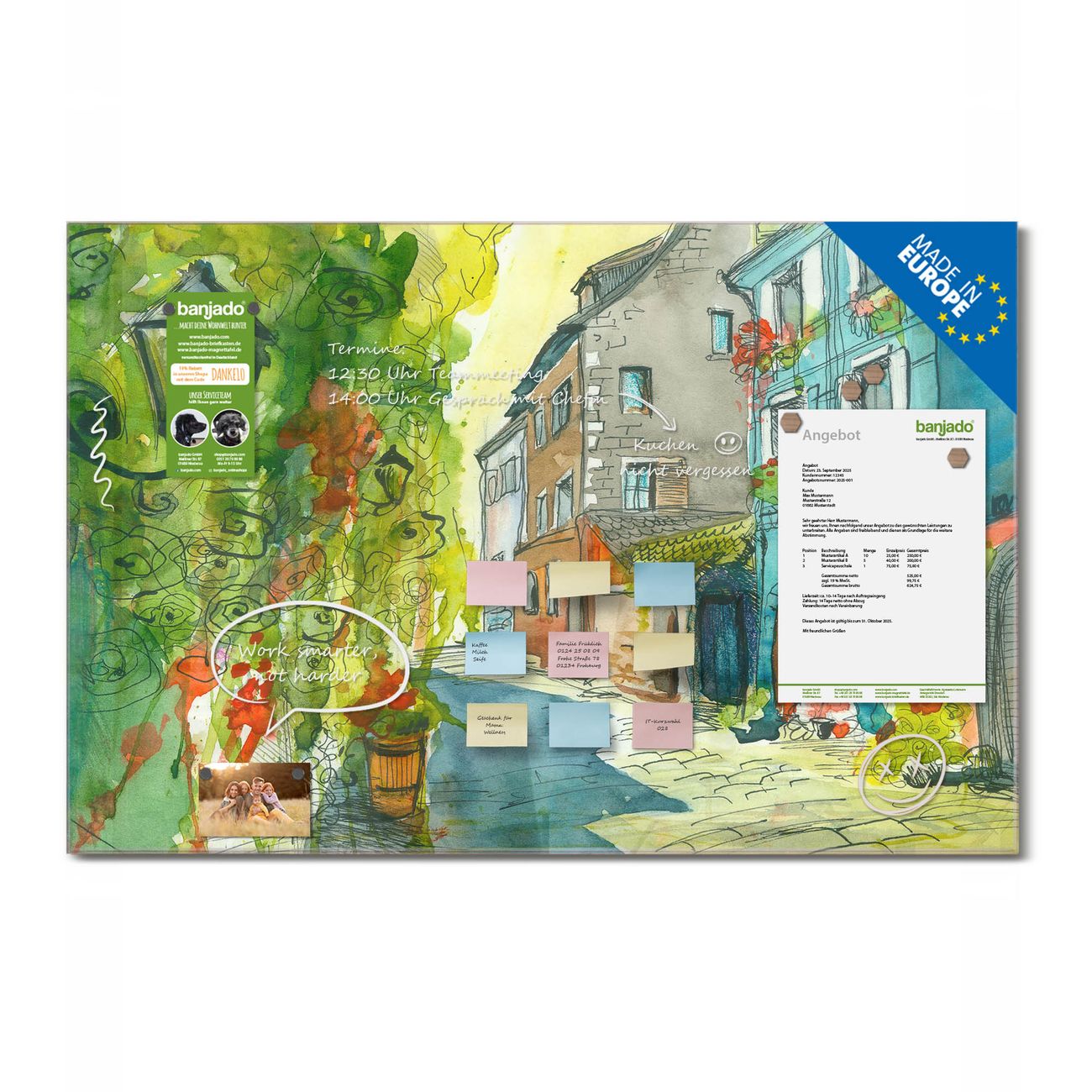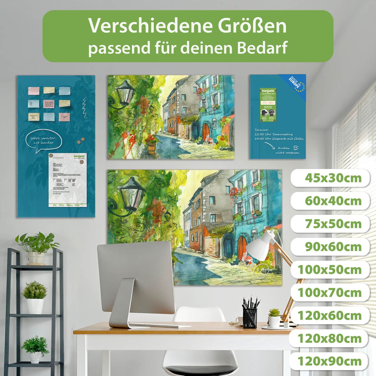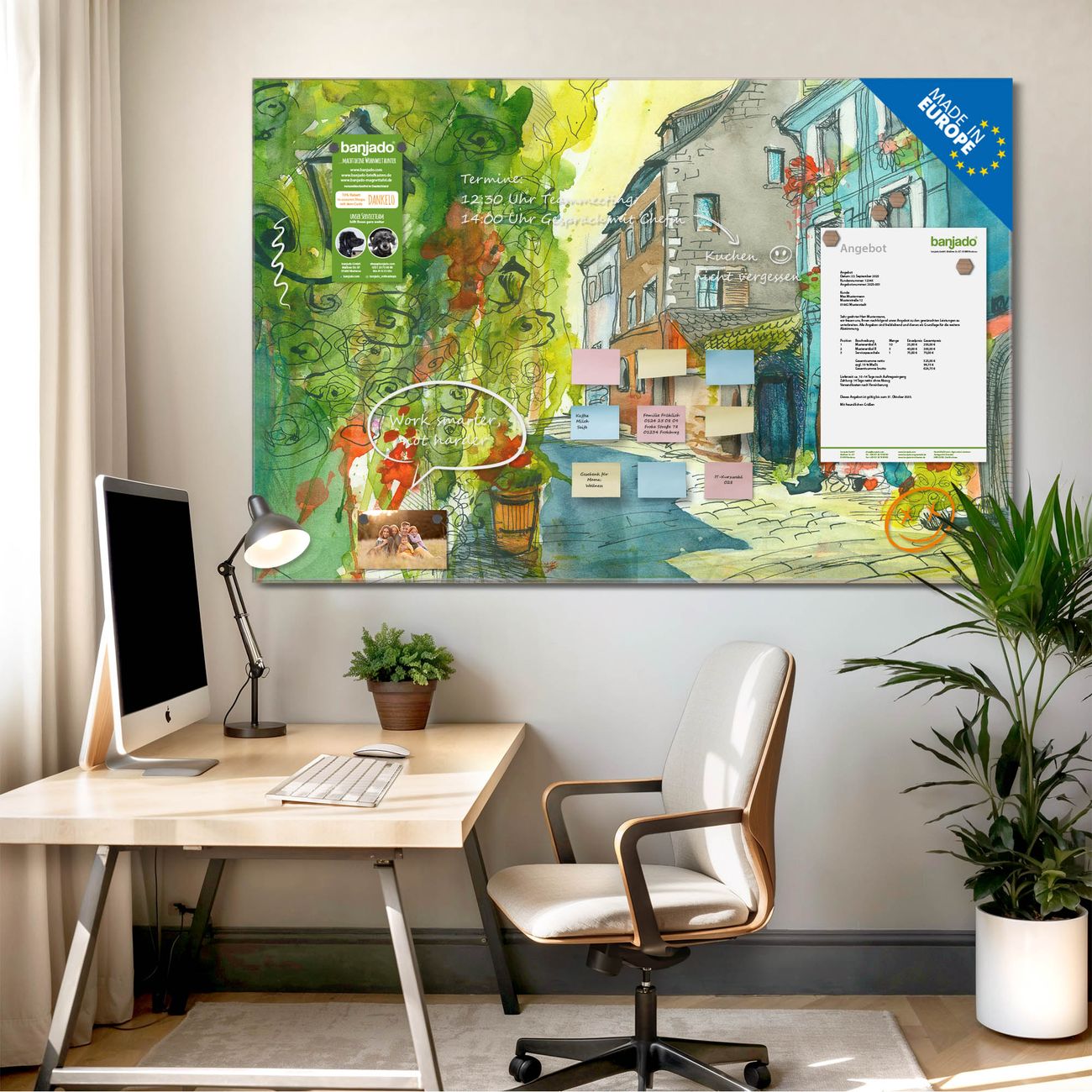 Jede Glas Magnettafel wird in unserer Werkstatt von Hand gefertigt und sorgfältig geprüft. So erhalten Sie ein echtes Qualitätsprodukt, das Funktion und Ästhetik perfekt vereint.?? Warum banjado?