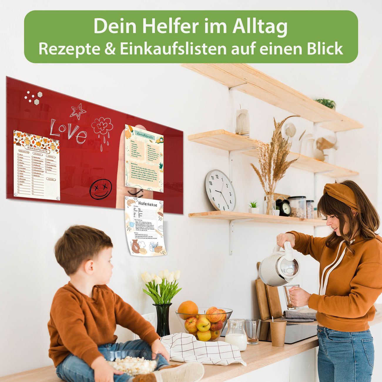 Auf der glatten Glasoberfläche lassen sich Termine, Rezepte oder Notizen ganz einfach mit Kreidestiften festhalten und rückstandslos entfernen. Starke Neodym-Magnete halten Ihre wichtigsten Erinnerungen sicher an Ort und Stelle. So entsteht Ihre ganz persönliche Ideenwand - jeden Tag neu.