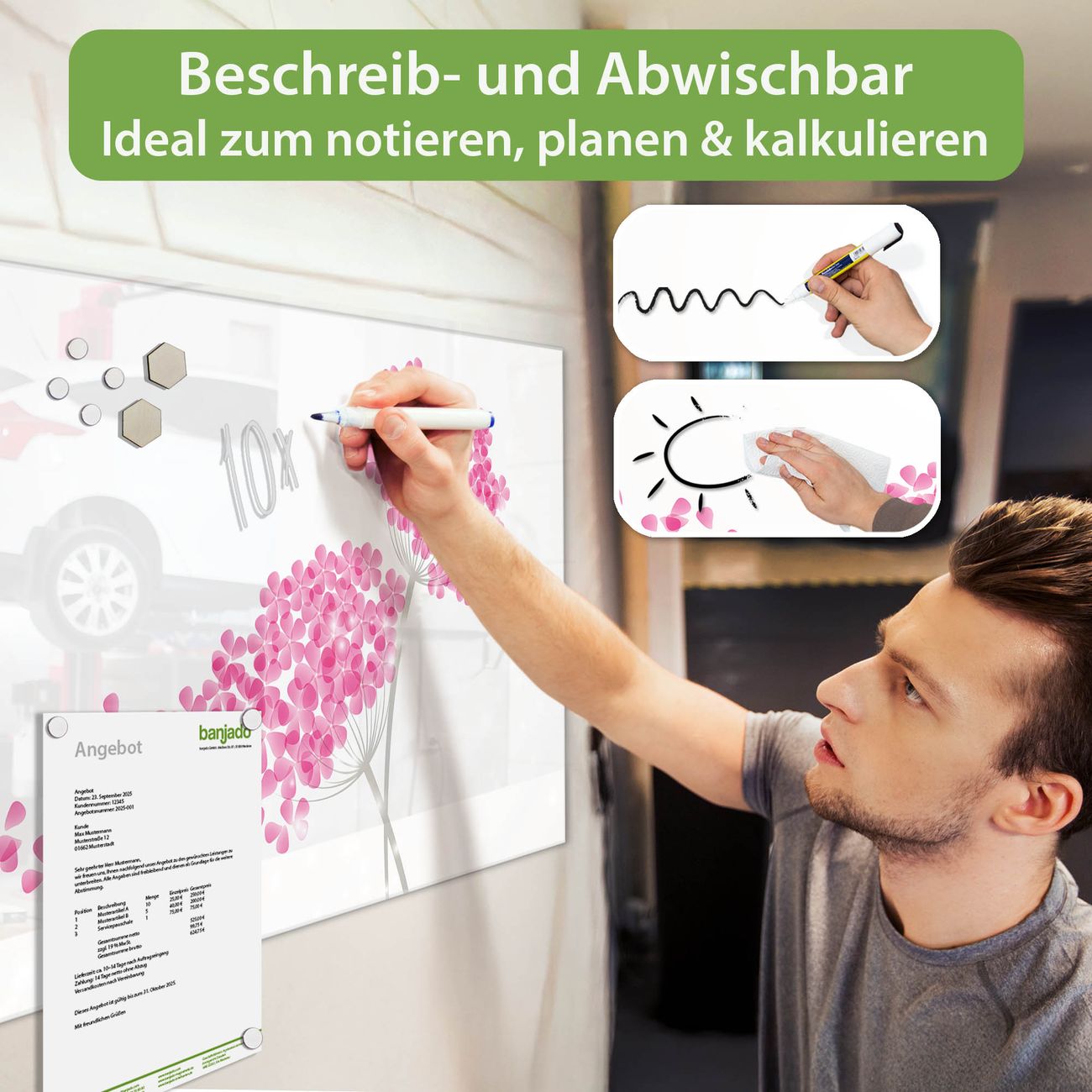 Bitte beachten Sie, dass ausschliessliche spezielle Magnete an der Glastafel haften. Wir empfehlen banjado Neodym Magnete, diese sind durch uns auf Wirksamkeit geprüft.