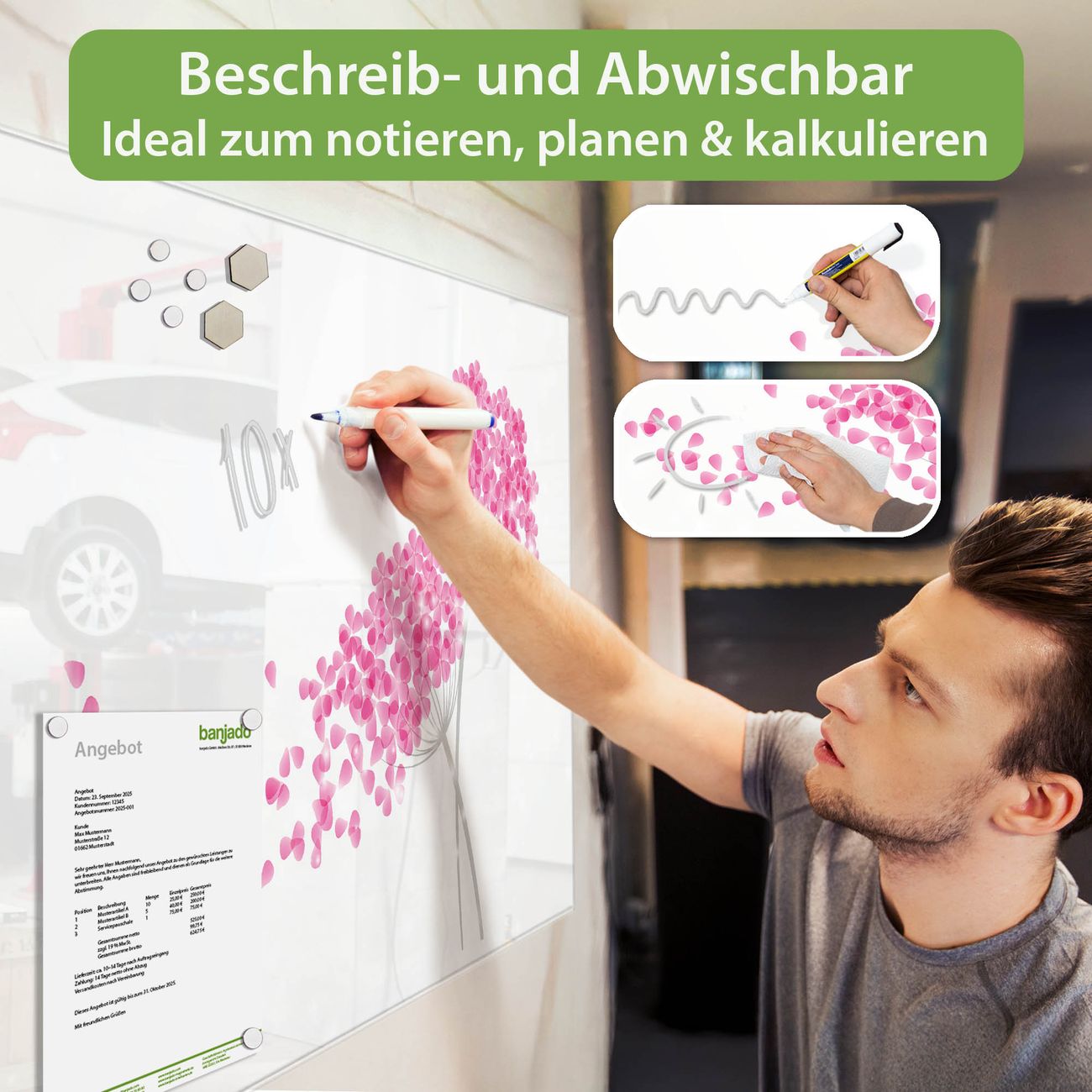 Jede Glas Magnettafel wird in unserer Werkstatt von Hand gefertigt und sorgfältig geprüft. So erhalten Sie ein echtes Qualitätsprodukt, das Funktion und Ästhetik perfekt vereint.?? Warum banjado?