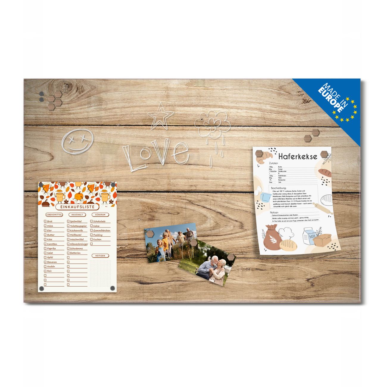 Ein Stück Design, das Ihren Alltag organisiert. Schreiben, heften, inspirieren - alles an einem Ort. Qualität, die man spürt. Montage leicht gemacht. Handwerk mit Herz - veredelt in Sachsen. Einzigartiges Design mit Motiv Motiv Holzplanken Beschreibbare Glasoberfläche, leicht zu reinigen Starke Magnetkraft durch Stahlrückwand Inklusive 4 Neodym-Magneten Flexible Montageoptionen Handveredelt in Sachsen - Qualität, die bleibt
