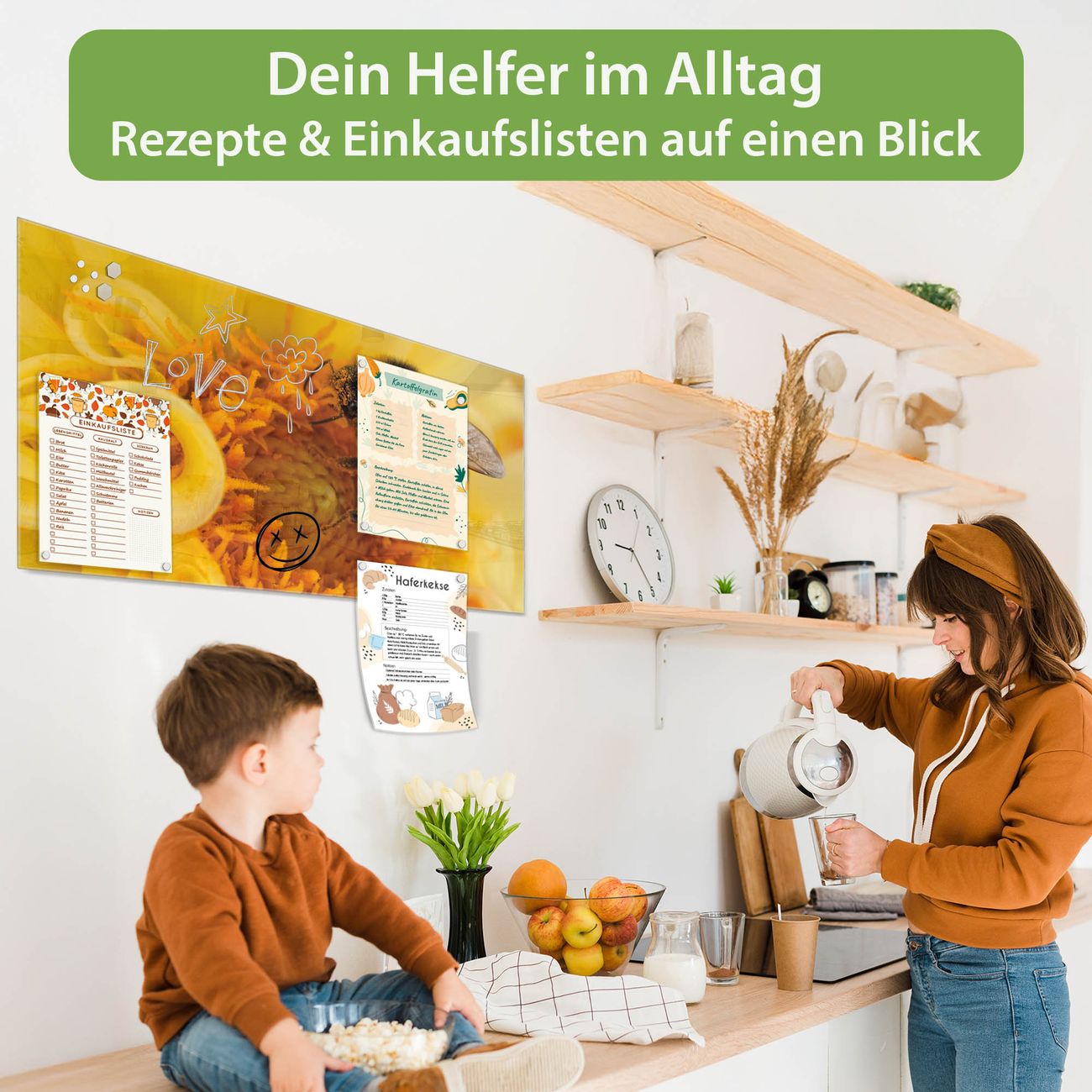 Auf der glatten Glasoberfläche lassen sich Termine, Rezepte oder Notizen ganz einfach mit Kreidestiften festhalten und rückstandslos entfernen. Starke Neodym-Magnete halten Ihre wichtigsten Erinnerungen sicher an Ort und Stelle. So entsteht Ihre ganz persönliche Ideenwand - jeden Tag neu.