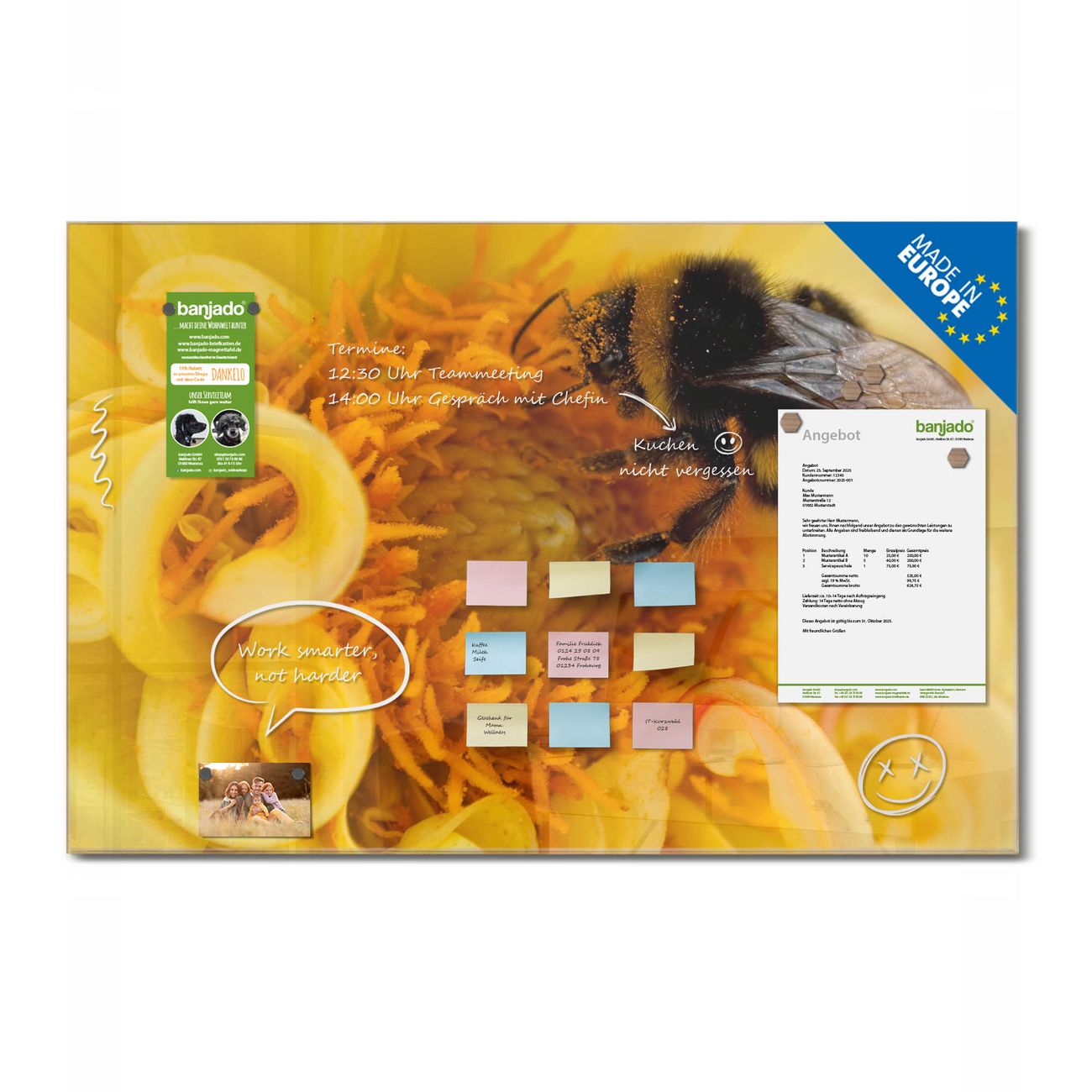 Die banjado Glas Magnettafel mit dem Motiv Motiv Hummel verbindet Funktionalität mit Stil. Sie ersetzt das Zettelchaos durch klare Strukturen und bringt dabei eine warme, natürliche Atmosphäre in Ihr Zuhause. Ob im Büro, in der Küche oder im Eingangsbereich - dieses Design-Board zieht Blicke an und sorgt für Ordnung mit Charakter.