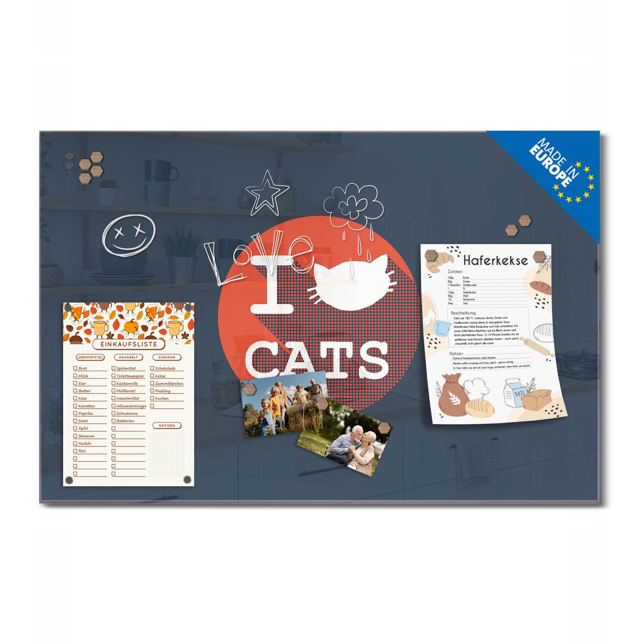 Ein Stück Design, das Ihren Alltag organisiert. Schreiben, heften, inspirieren - alles an einem Ort. Qualität, die man spürt. Montage leicht gemacht. Handwerk mit Herz - veredelt in Sachsen. Einzigartiges Design mit Motiv Motiv I Love Cats Beschreibbare Glasoberfläche, leicht zu reinigen Starke Magnetkraft durch Stahlrückwand Inklusive 4 Neodym-Magneten Flexible Montageoptionen Handveredelt in Sachsen - Qualität, die bleibt