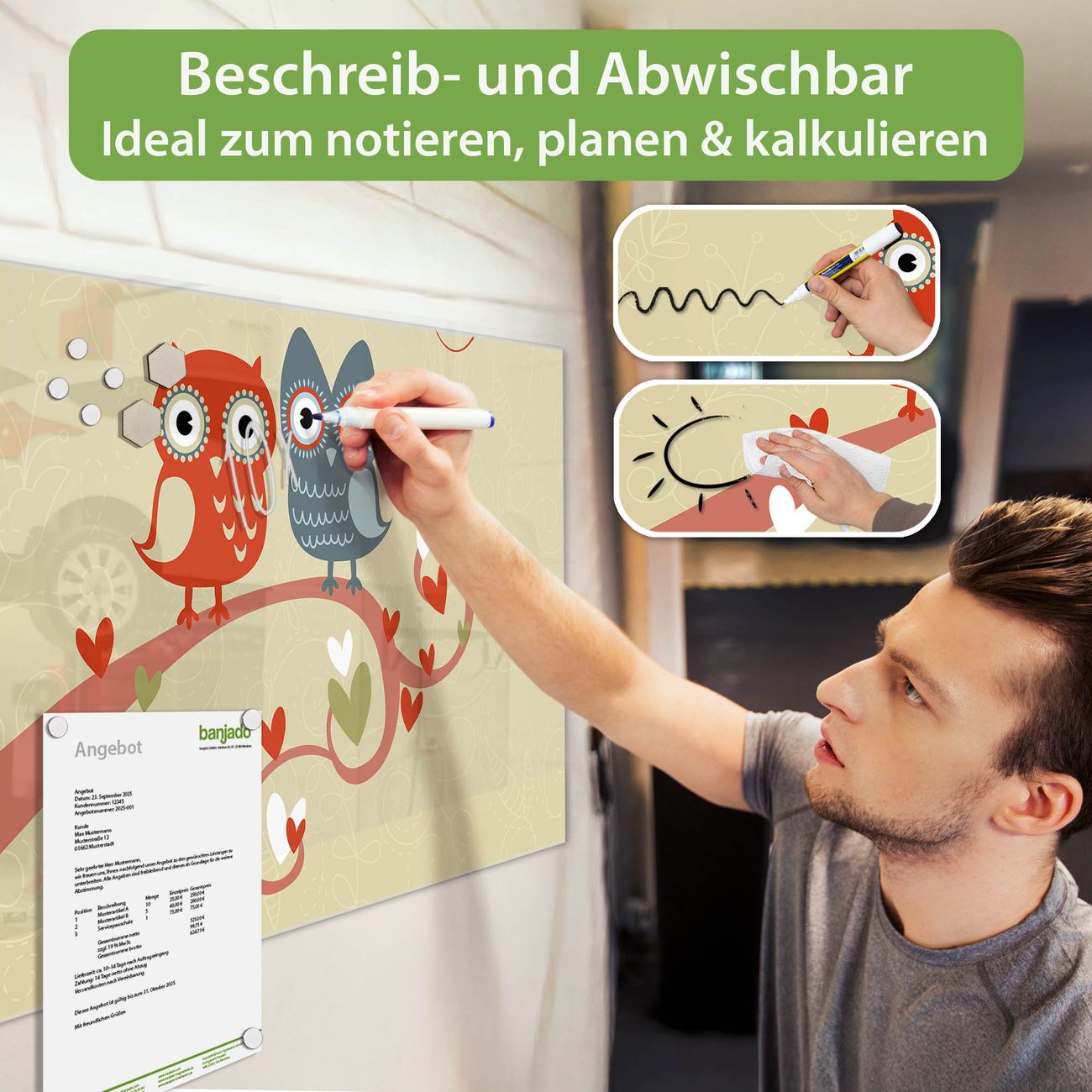 Jede Glas Magnettafel wird in unserer Werkstatt von Hand gefertigt und sorgfältig geprüft. So erhalten Sie ein echtes Qualitätsprodukt, das Funktion und Ästhetik perfekt vereint.?? Warum banjado?