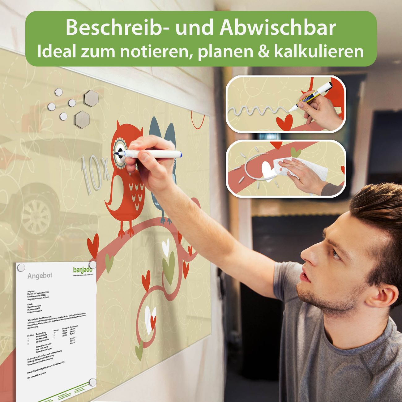Bitte beachten Sie, dass ausschliessliche spezielle Magnete an der Glastafel haften. Wir empfehlen banjado Neodym Magnete, diese sind durch uns auf Wirksamkeit geprüft.