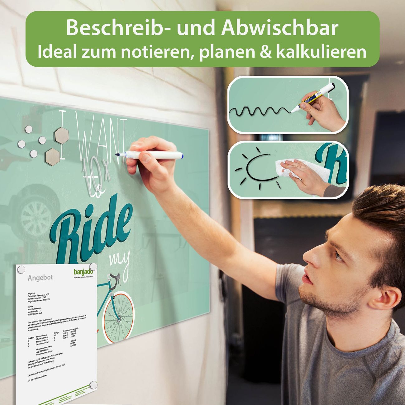 Die banjado Glas Magnettafel mit dem Motiv Motiv I want to ride my bike verbindet Funktionalität mit Stil. Sie ersetzt das Zettelchaos durch klare Strukturen und bringt dabei eine warme, natürliche Atmosphäre in Ihr Zuhause. Ob im Büro, in der Küche oder im Eingangsbereich - dieses Design-Board zieht Blicke an und sorgt für Ordnung mit Charakter.