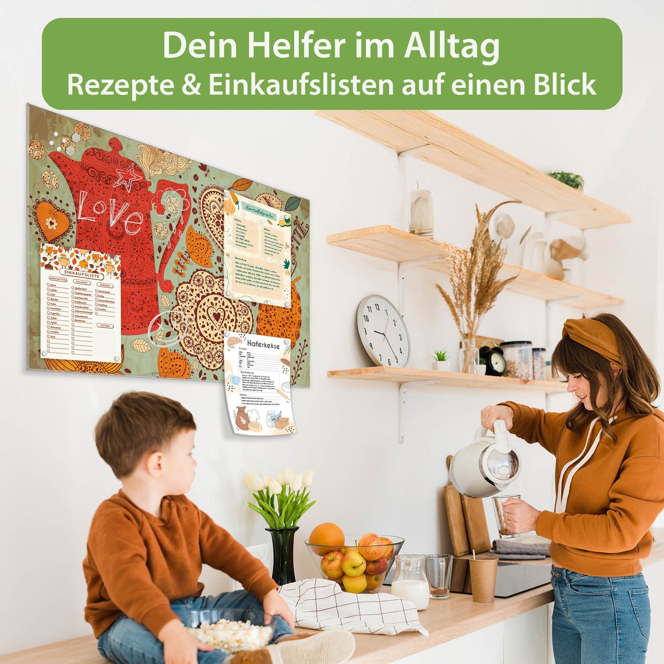 Auf der glatten Glasoberfläche lassen sich Termine, Rezepte oder Notizen ganz einfach mit Kreidestiften festhalten und rückstandslos entfernen. Starke Neodym-Magnete halten Ihre wichtigsten Erinnerungen sicher an Ort und Stelle. So entsteht Ihre ganz persönliche Ideenwand - jeden Tag neu.