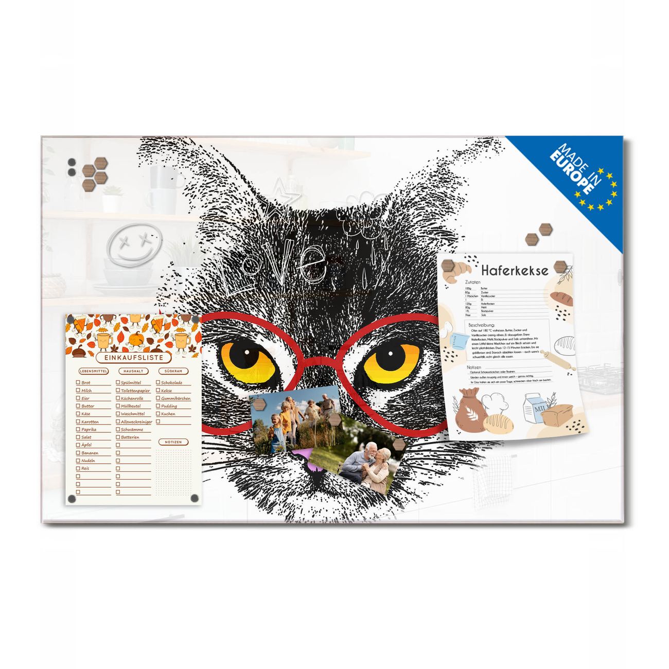Ein Stück Design, das Ihren Alltag organisiert. Schreiben, heften, inspirieren - alles an einem Ort. Qualität, die man spürt. Montage leicht gemacht. Handwerk mit Herz - veredelt in Sachsen. Einzigartiges Design mit Motiv Motiv Intellicat Beschreibbare Glasoberfläche, leicht zu reinigen Starke Magnetkraft durch Stahlrückwand Inklusive 4 Neodym-Magneten Flexible Montageoptionen Handveredelt in Sachsen - Qualität, die bleibt