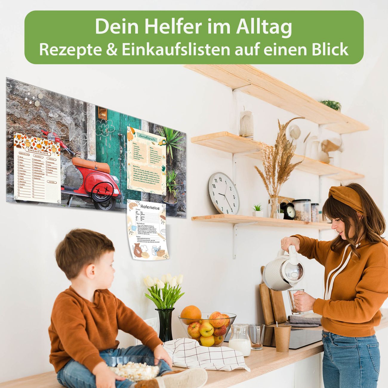 Ein Stück Design, das Ihren Alltag organisiert. Schreiben, heften, inspirieren - alles an einem Ort. Qualität, die man spürt. Montage leicht gemacht. Handwerk mit Herz - veredelt in Sachsen. Einzigartiges Design mit Motiv Motiv Italienischer Roller Beschreibbare Glasoberfläche, leicht zu reinigen Starke Magnetkraft durch Stahlrückwand Inklusive 4 Neodym-Magneten Flexible Montageoptionen Handveredelt in Sachsen - Qualität, die bleibt