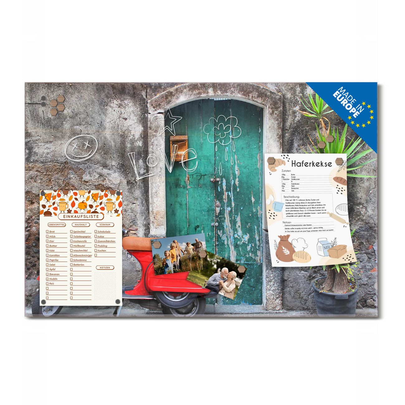 Ein Stück Design, das Ihren Alltag organisiert. Schreiben, heften, inspirieren - alles an einem Ort. Qualität, die man spürt. Montage leicht gemacht. Handwerk mit Herz - veredelt in Sachsen. Einzigartiges Design mit Motiv Motiv Italienischer Roller Beschreibbare Glasoberfläche, leicht zu reinigen Starke Magnetkraft durch Stahlrückwand Inklusive 4 Neodym-Magneten Flexible Montageoptionen Handveredelt in Sachsen - Qualität, die bleibt
