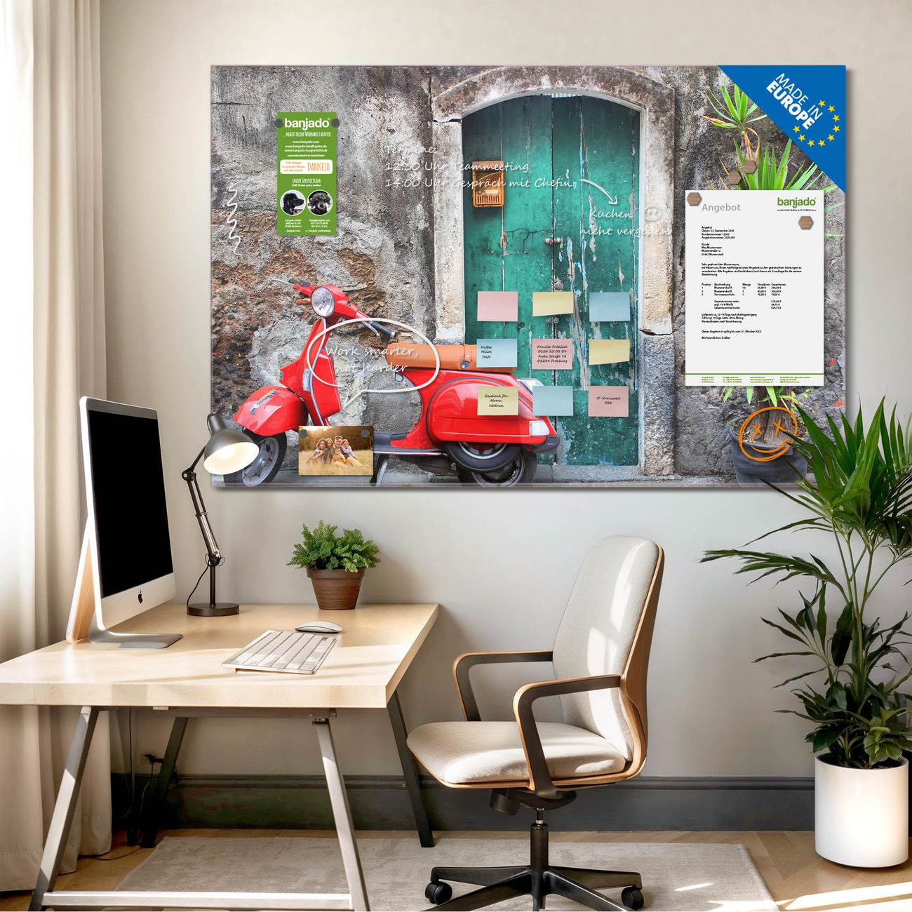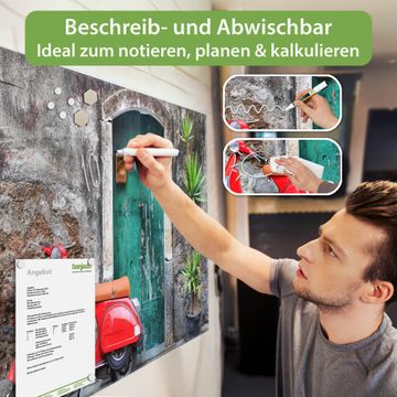 Die banjado Glas Magnettafel mit dem Motiv Motiv Italienischer Roller verbindet Funktionalität mit Stil. Sie ersetzt das Zettelchaos durch klare Strukturen und bringt dabei eine warme, natürliche Atmosphäre in Ihr Zuhause. Ob im Büro, in der Küche oder im Eingangsbereich - dieses Design-Board zieht Blicke an und sorgt für Ordnung mit Charakter.