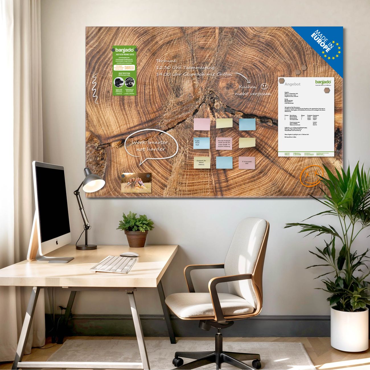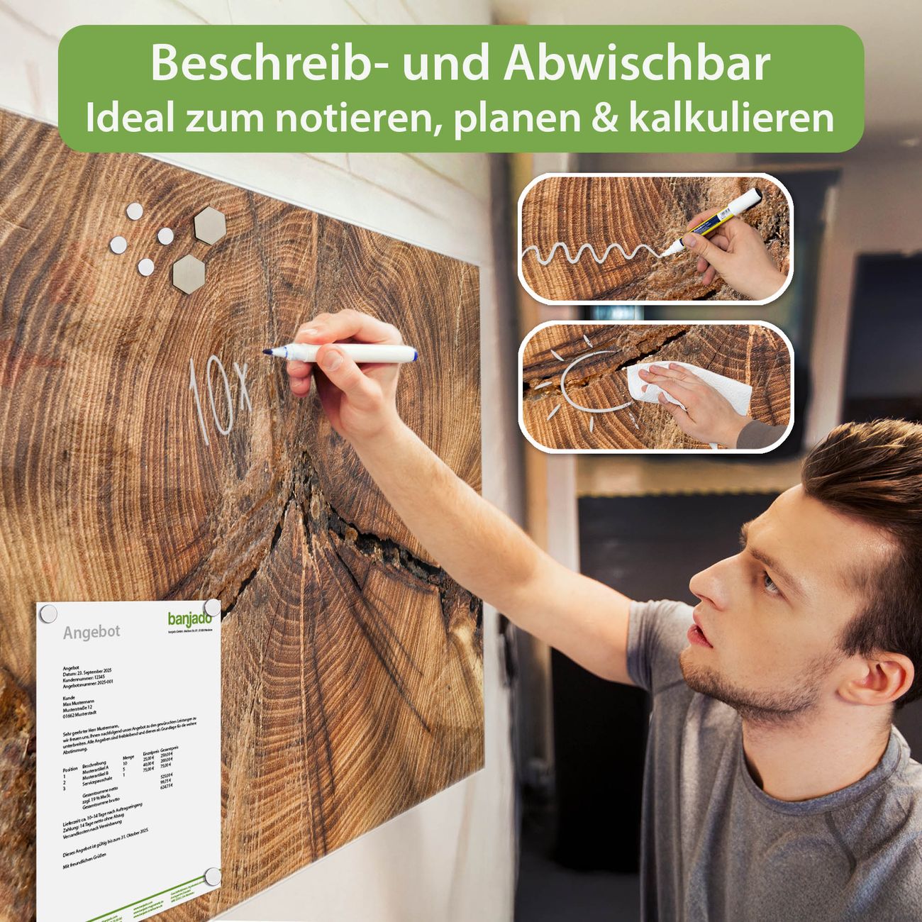 Jede Glas Magnettafel wird in unserer Werkstatt von Hand gefertigt und sorgfältig geprüft. So erhalten Sie ein echtes Qualitätsprodukt, das Funktion und Ästhetik perfekt vereint.?? Warum banjado?