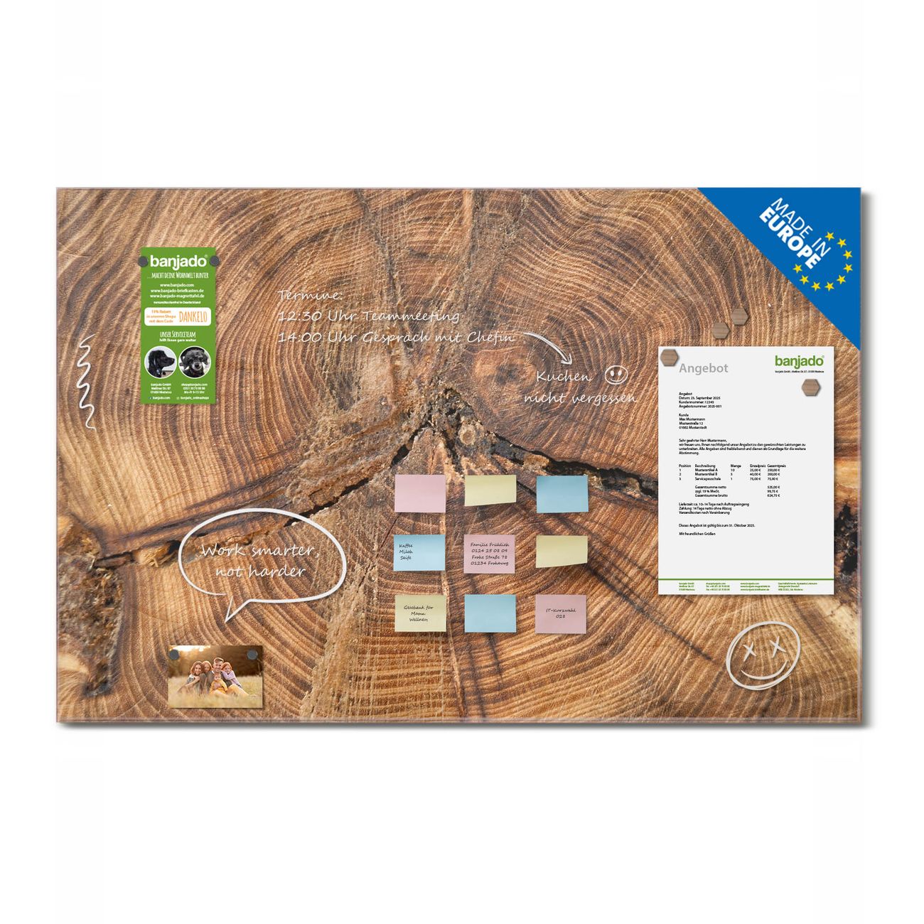 Jede Glas Magnettafel wird in unserer Werkstatt von Hand gefertigt und sorgfältig geprüft. So erhalten Sie ein echtes Qualitätsprodukt, das Funktion und Ästhetik perfekt vereint.?? Warum banjado?