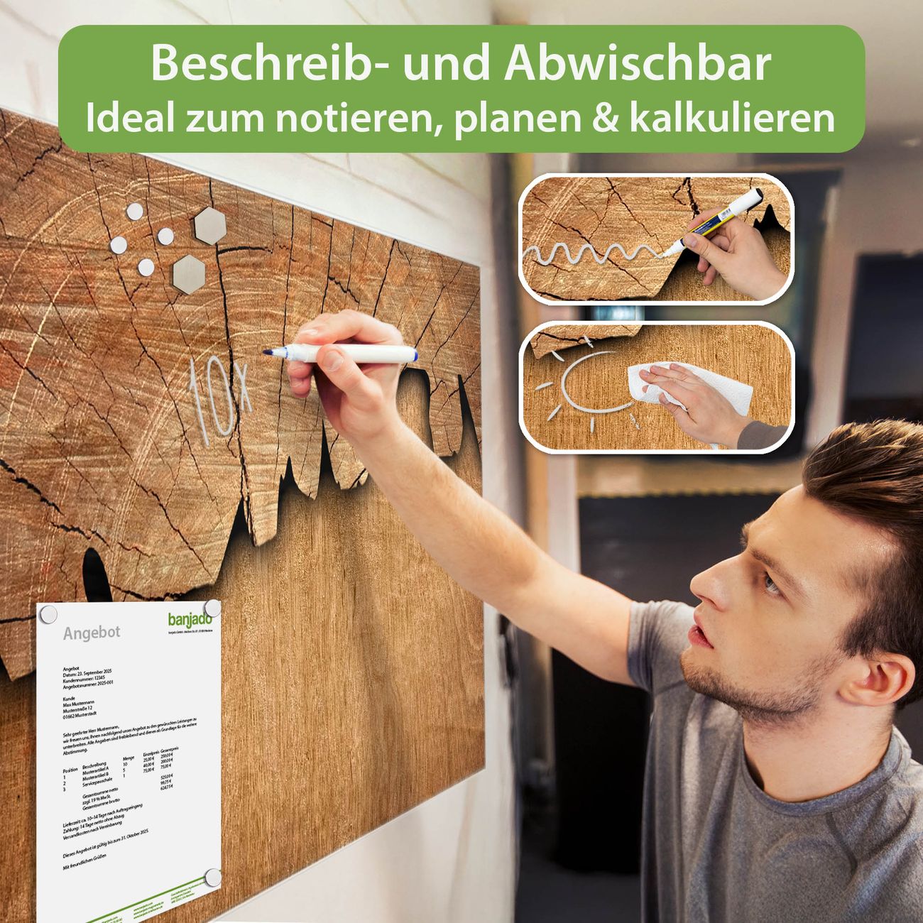 Jede Glas Magnettafel wird in unserer Werkstatt von Hand gefertigt und sorgfältig geprüft. So erhalten Sie ein echtes Qualitätsprodukt, das Funktion und Ästhetik perfekt vereint.?? Warum banjado?