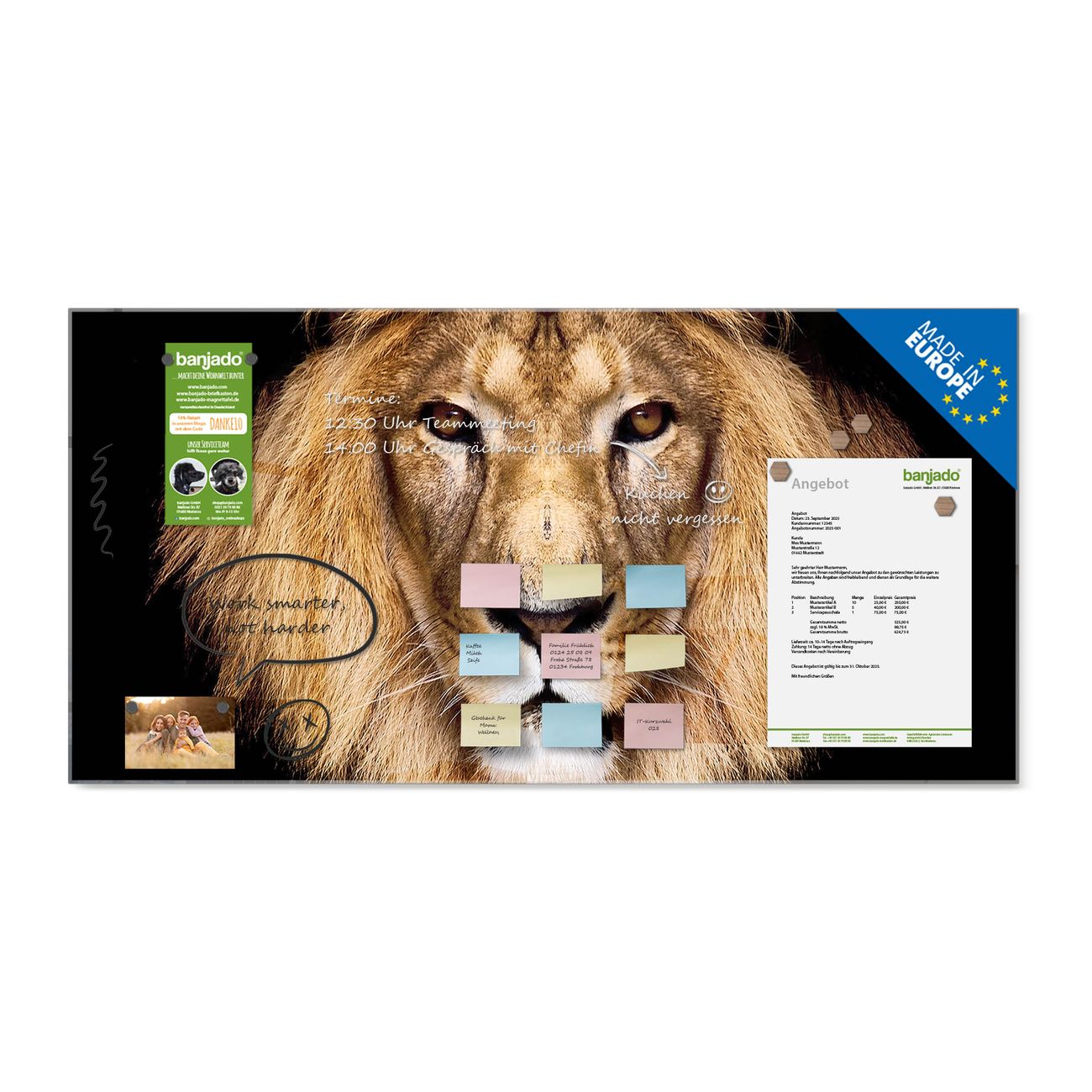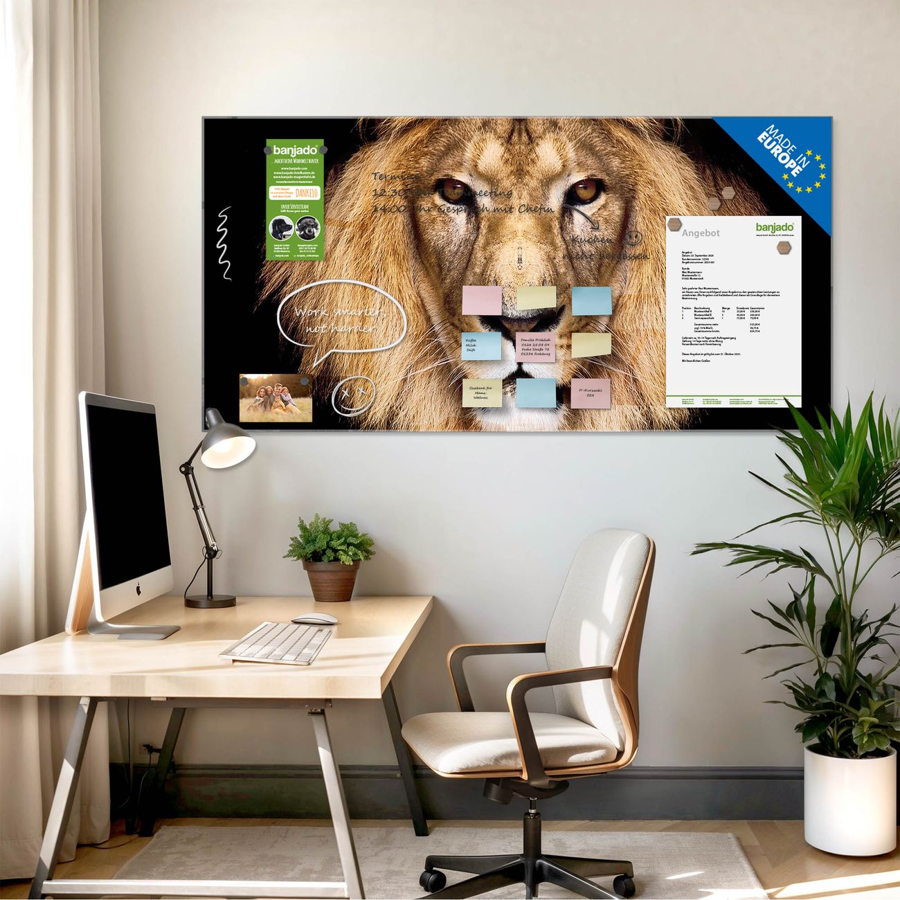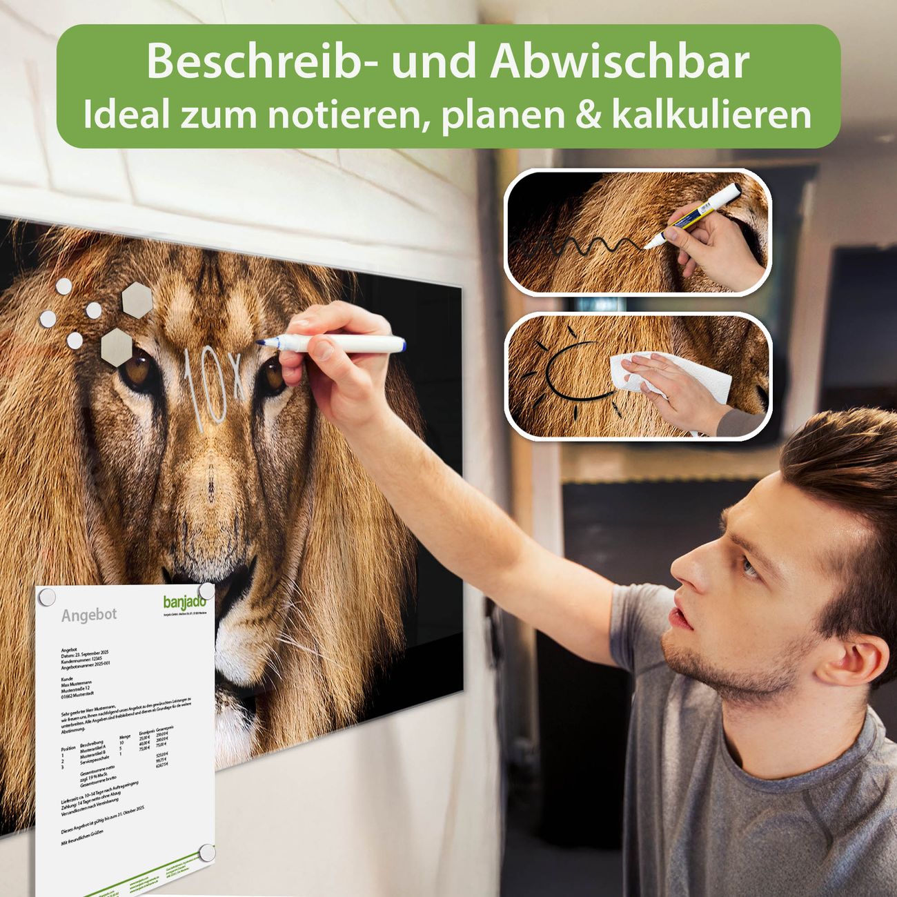 Jede Glas Magnettafel wird in unserer Werkstatt von Hand gefertigt und sorgfältig geprüft. So erhalten Sie ein echtes Qualitätsprodukt, das Funktion und Ästhetik perfekt vereint.?? Warum banjado?