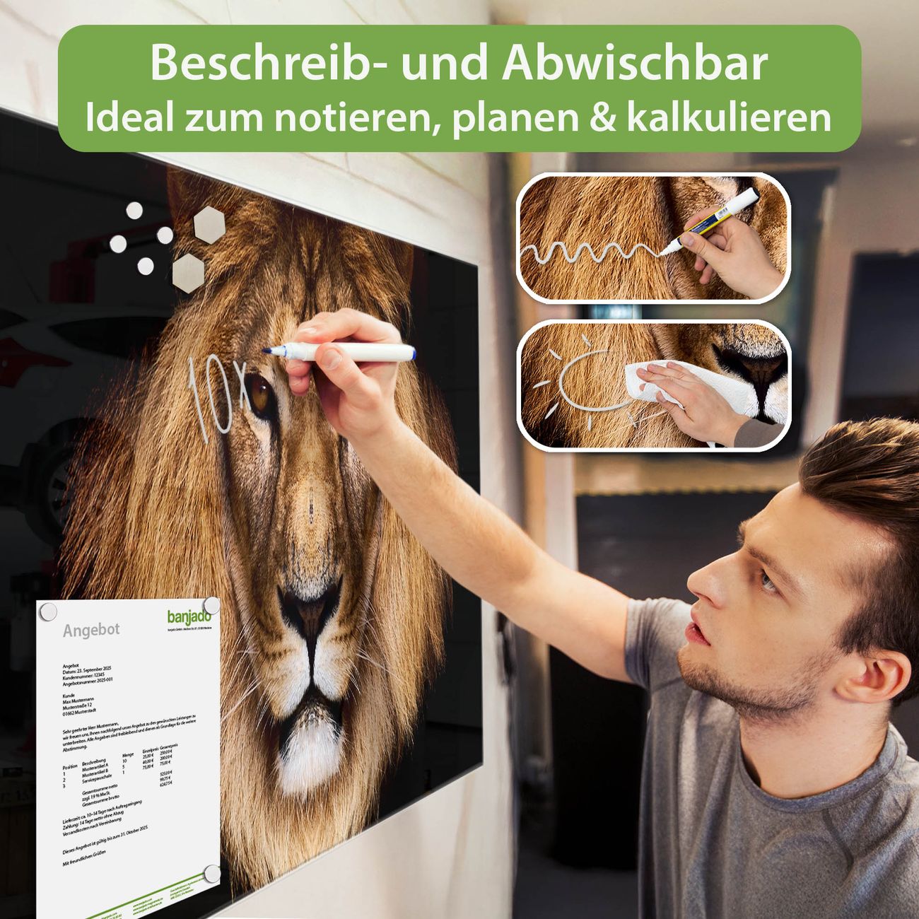 Jede Glas Magnettafel wird in unserer Werkstatt von Hand gefertigt und sorgfältig geprüft. So erhalten Sie ein echtes Qualitätsprodukt, das Funktion und Ästhetik perfekt vereint.?? Warum banjado?